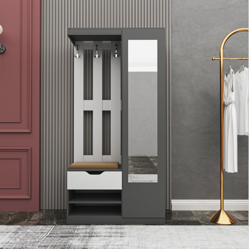 جاکفشی .جنس نئوپان ملامینه.دارای یک درب کمدی شامل هفت طبقه و هشت فضا.طراحی مدرن.دستگیره به صورت مگنتی.دارای یک کشو با دستگیره سی ان سی.و دو فضای مجزا.روی درب دارای آینه قدی می باشد.دارای فضای نشمن لمسه پارچه مبلی کرم رنگ می باشد.فضای نشمین دارای فضای آویز لباس است-ال در بسته بندی با برند و لوگو .تنها در صورتی کالای انتخابی مطابق با تصاویر و مشخصات درج شده خواهد بود که هنگام انتخاب فروشنده، فروشنده رسمی برند که با تیک آبی مشخص شده است را انتخاب نمایید.xهنگام خرید و دریافت کالا به بسته بندی و لوگوی برند دقت فرمایید. این کالا توسط برند در رنگ های سفید/مشکی/قهوه ای/گردویی/قهوه ای روشن/ قهوه ای تیره(ونگه)/طوسی و چندرنگ(طوسی و سفید) تولید می شود.