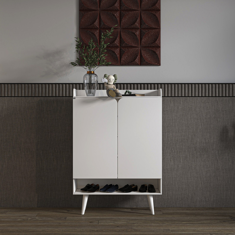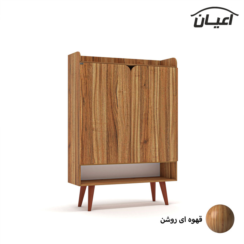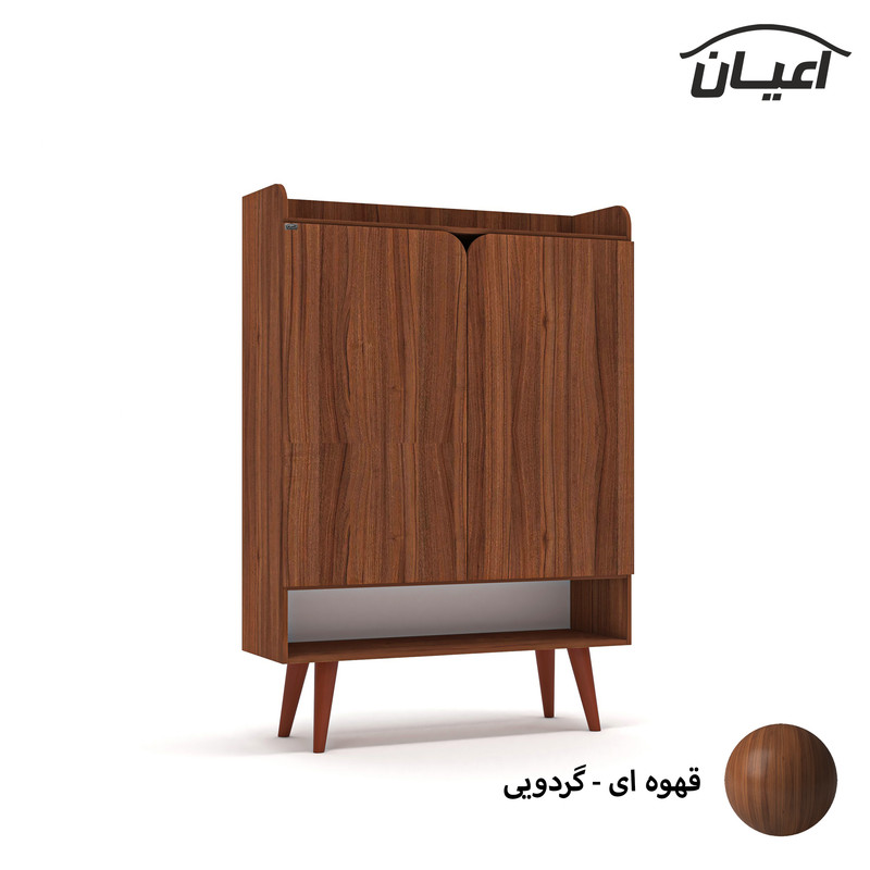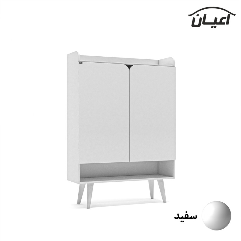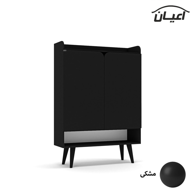 جاکفشی .جنس نئوپان ملامینه.دارای دو درب بازشو کمدی درب ها به صورت آرام بند.دارای چهار طبقه و یک قفسه . ال در بسته بندی با لوگوی برند انجام می شود.این کالا توسط برند در رنگ های سفید/مشکی/قهوه ای/قهوه ای روشن/قهوه ای تیره(ونگه) و حالت چند رنگ تولید می شود. تمام رنگ بندی این کالا در آلبوم قابل مشاهده است.