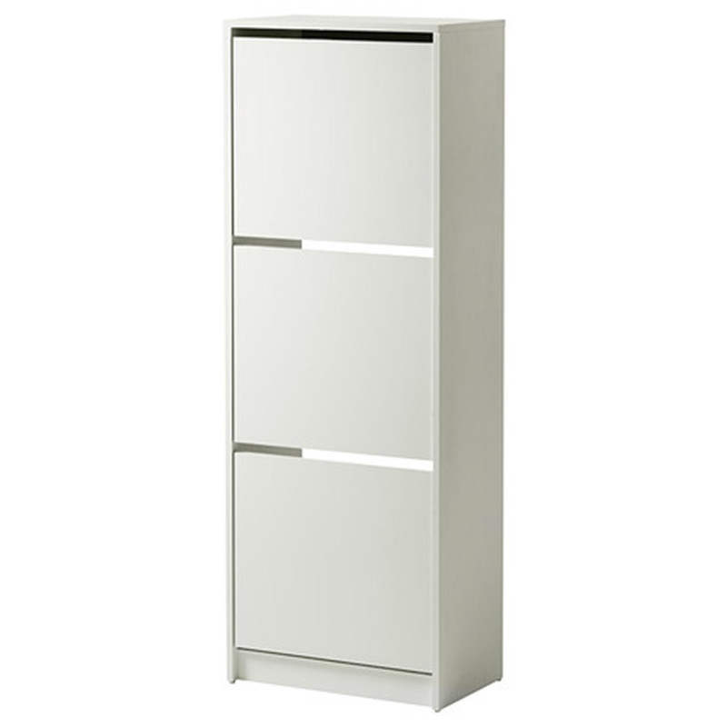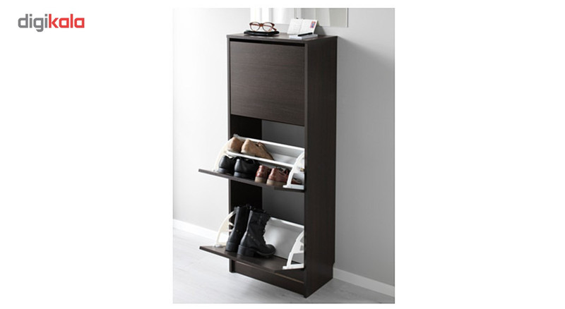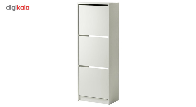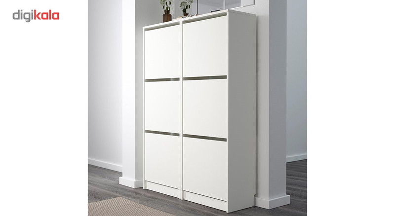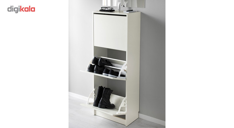 اگر برای نگهداری از کفشهایتان فضای زیادی در اختیار ندارید میتوانید از جاکفشی «Ikea» () مدل «Bissa» استفاده کنید. جاکفشی با طول و عرض متناسبش برای خانهها و آپارتمانهای کوچک انتخابی عالی محسوب میشود. نحوهی باز کردن درهای جاکفشی در این مدل متفاوت هستند و مانند بسیاری از محصولات موجود از کنار باز نمیشوند؛ بنابراین با باز شدن در بهصورت عمودی و از بالا به سمت پایین، جاکفشی به فضای زیادی نیاز ندارد و میتوان آن را در گوشهای از راهرو یا قسمتی از ورودی خانه جا داد. هر طبقه دارای یک تخته است که در مرکز قرار میگیرد و طبقه را به دو قسمت تقسیم میکند؛ بهاینترتیب چهار جفت کفش در هر طبقه جا میگیرند. میتوانید با برداشتن این تخته، کفشهای ساق بلند مانند بوت را بهانی داخل طبقات قرار دهید. یکی از ویژگیهای خاص و منحصربهفرد جاکفشی میتوان به تورفتگی قسمت پشتی آن اشاره کرد. همانطور که در تصاویر به چشم میخورد، یک تورفتگی در قسمت پایین و پشتی جاکفشی ایجاد شده است که قرنیز یا برجستگیهای پایین دیوار را در برمیگیرد؛ بهاینترتیب جاکفشی از قسمت پشت بهطور کامل به دیوار میچسبد و هیچ فضایی خالی نمیماند. مدل «Bissa» ترکیبی از نئوپان، پلاستیک و پلیاستایرن است و ازنظر کیفیت در سطح بهنسبت خوبی قرار دارد؛ بنابراین بهمرور زمان کیفیت آن تغییر نخواهد کرد.