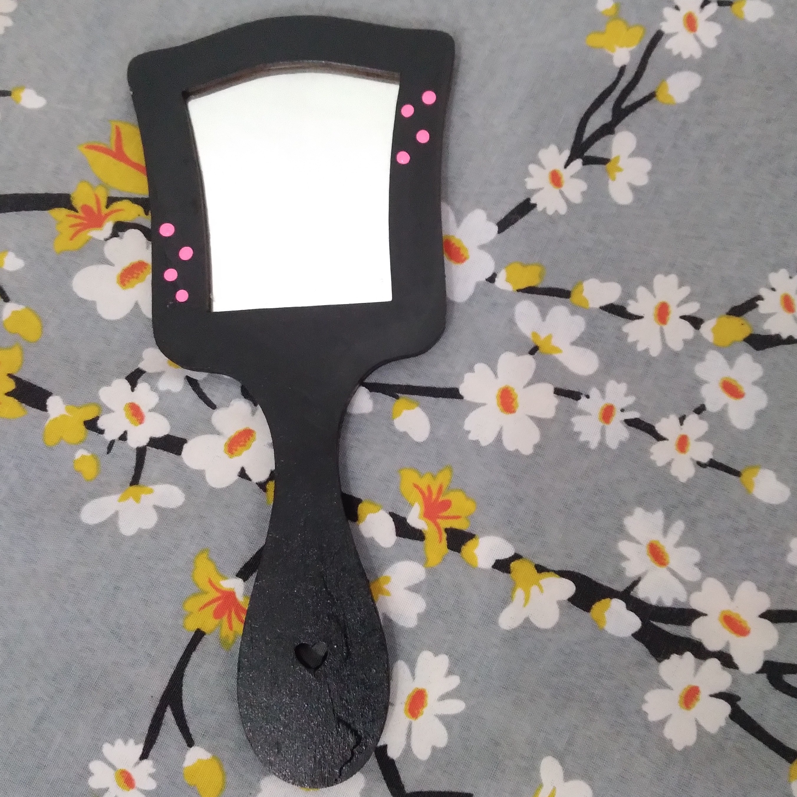 اینه چوبی دسته دار نقطه کوبی برای استفاده خانمهای خوش سلیقه قابل شستشو ولی بهتر است کارهای دست ساز با دستمال مرطوب تمیز شود
