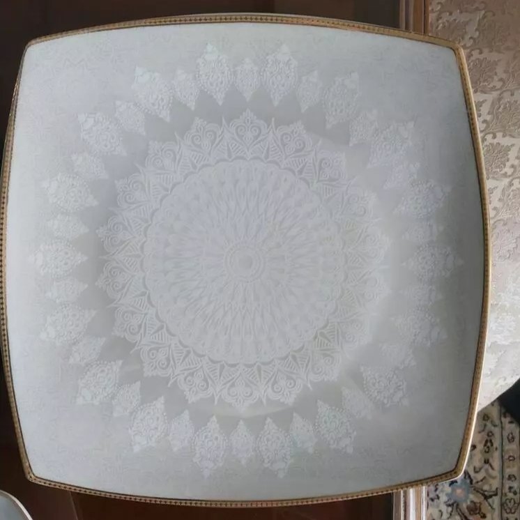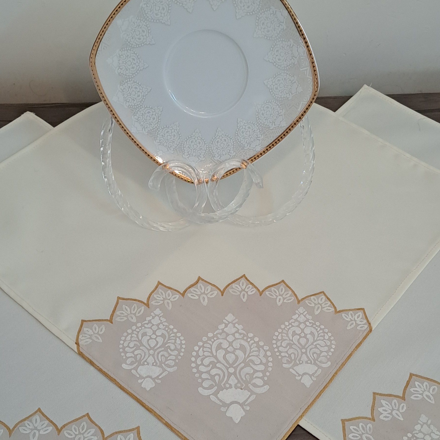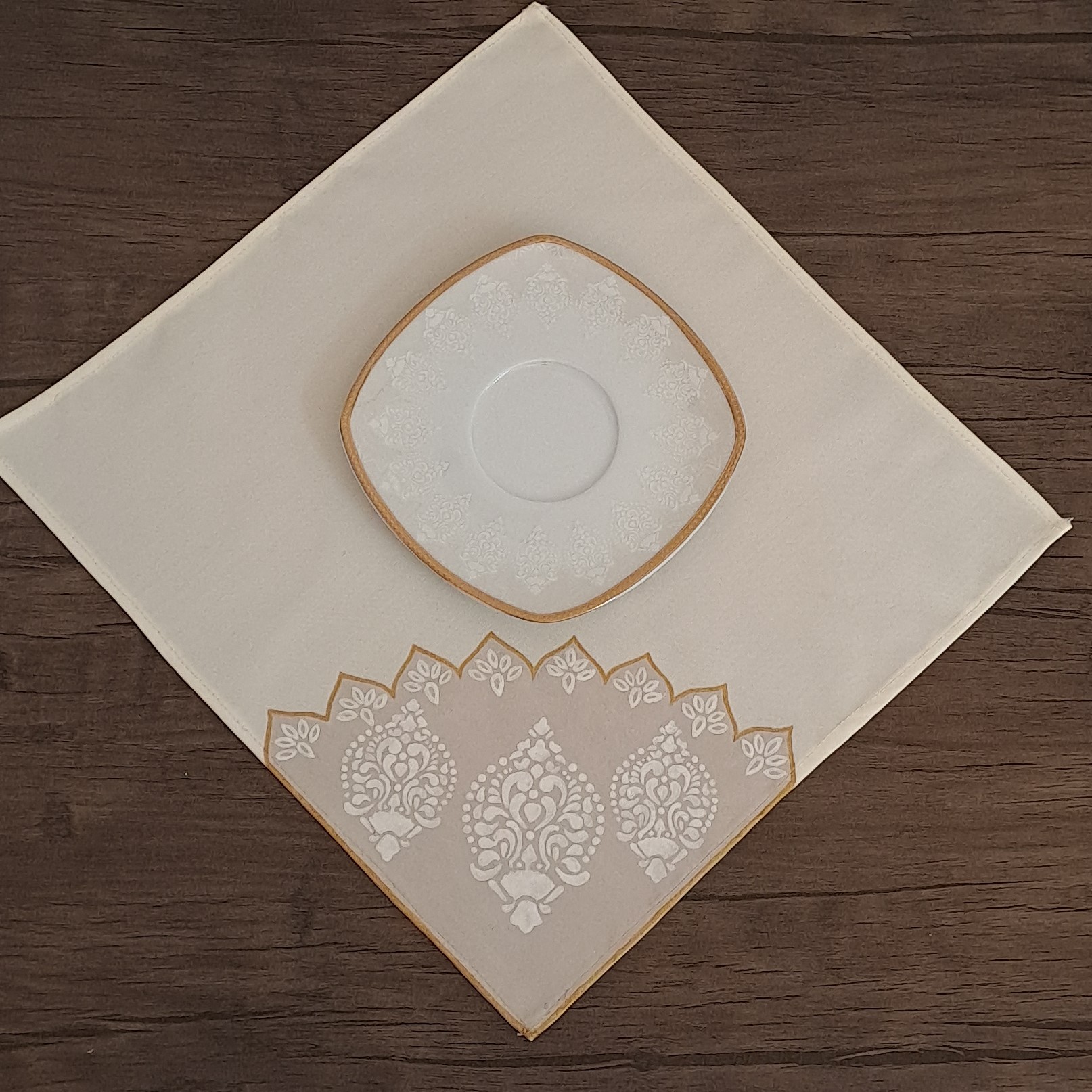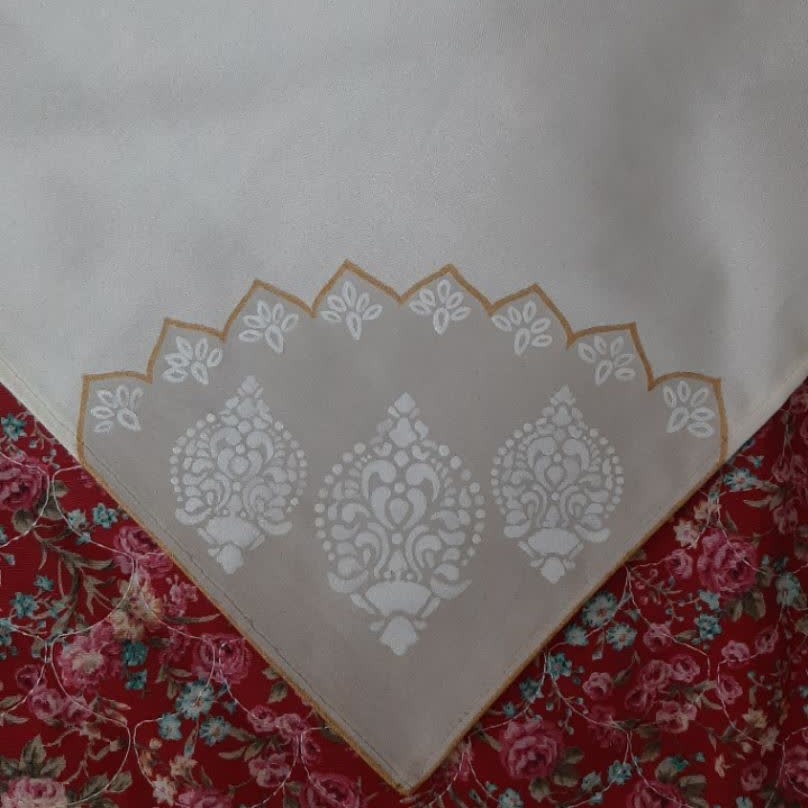 دستمال سفره پارچه ای نقاشی شده طبق طرح سرویس چینی به سفارش مشتری جنس پارچه ترگال کجراه اعلا رنگ ثابت و تضمینی مراحل تولید: برش دقیق پارچه آماده سازی طرح انتقال طرح روی پارچه آماده سازی رنگ رنگ آمیزی دوخت اتوی پارچه جهت تثبیت رنگ