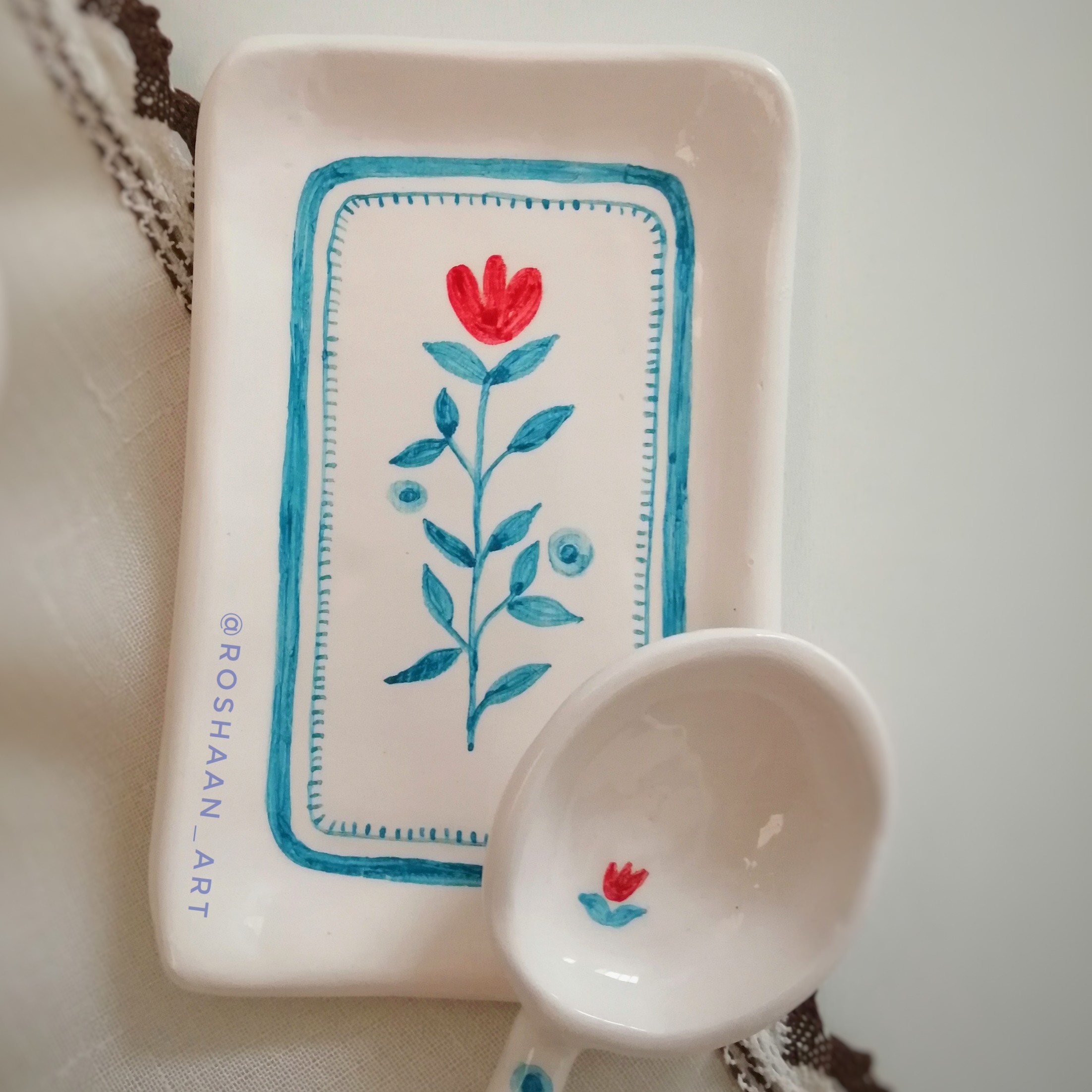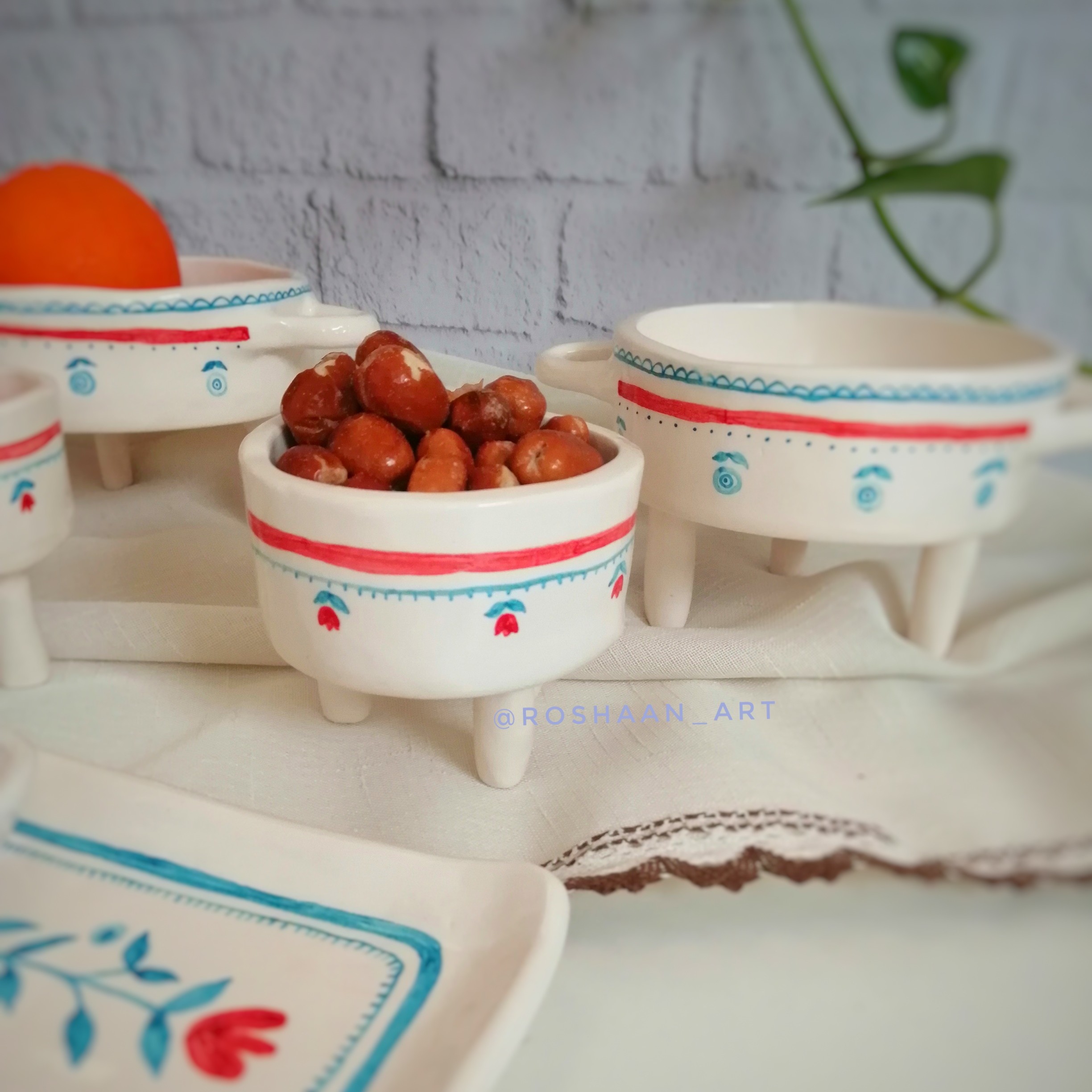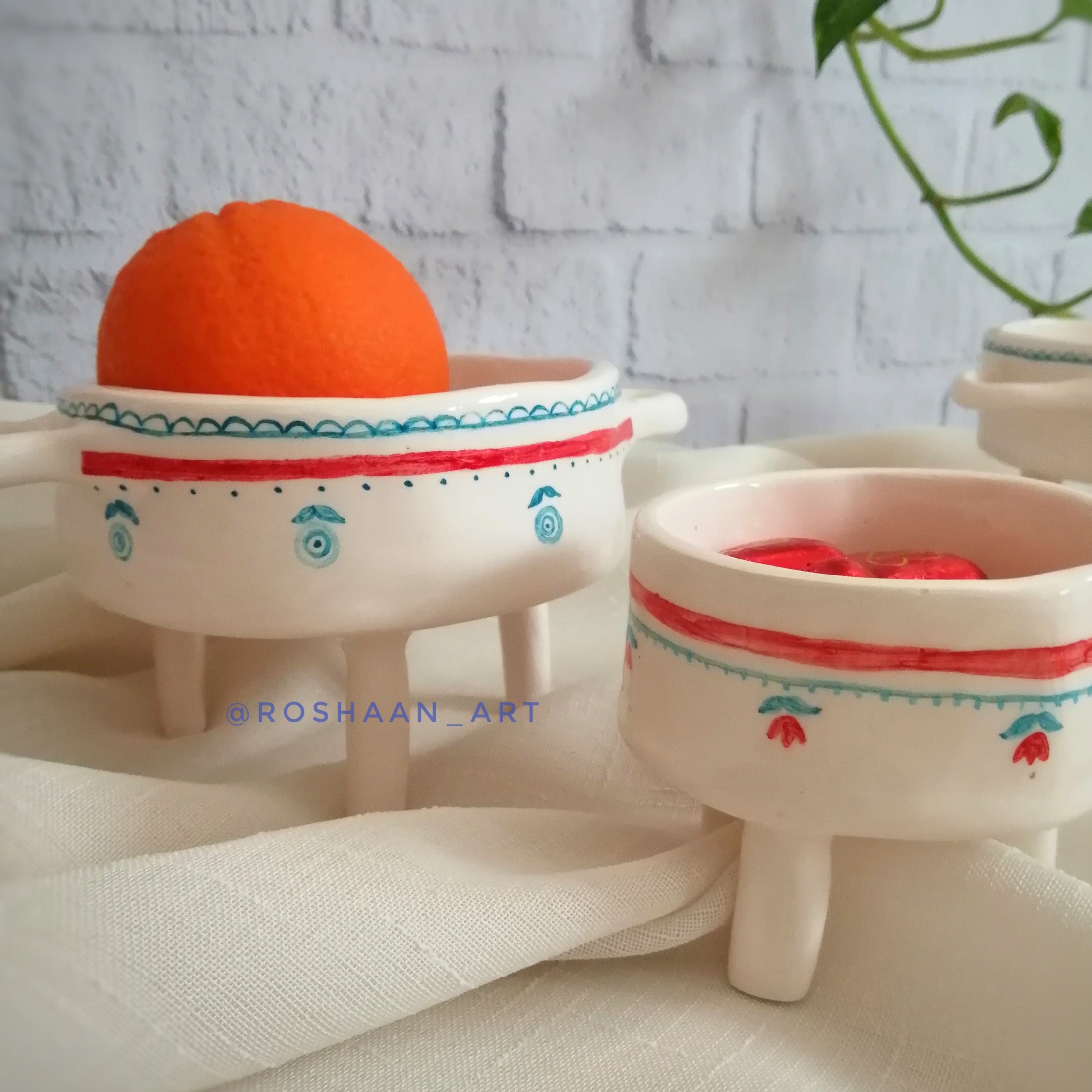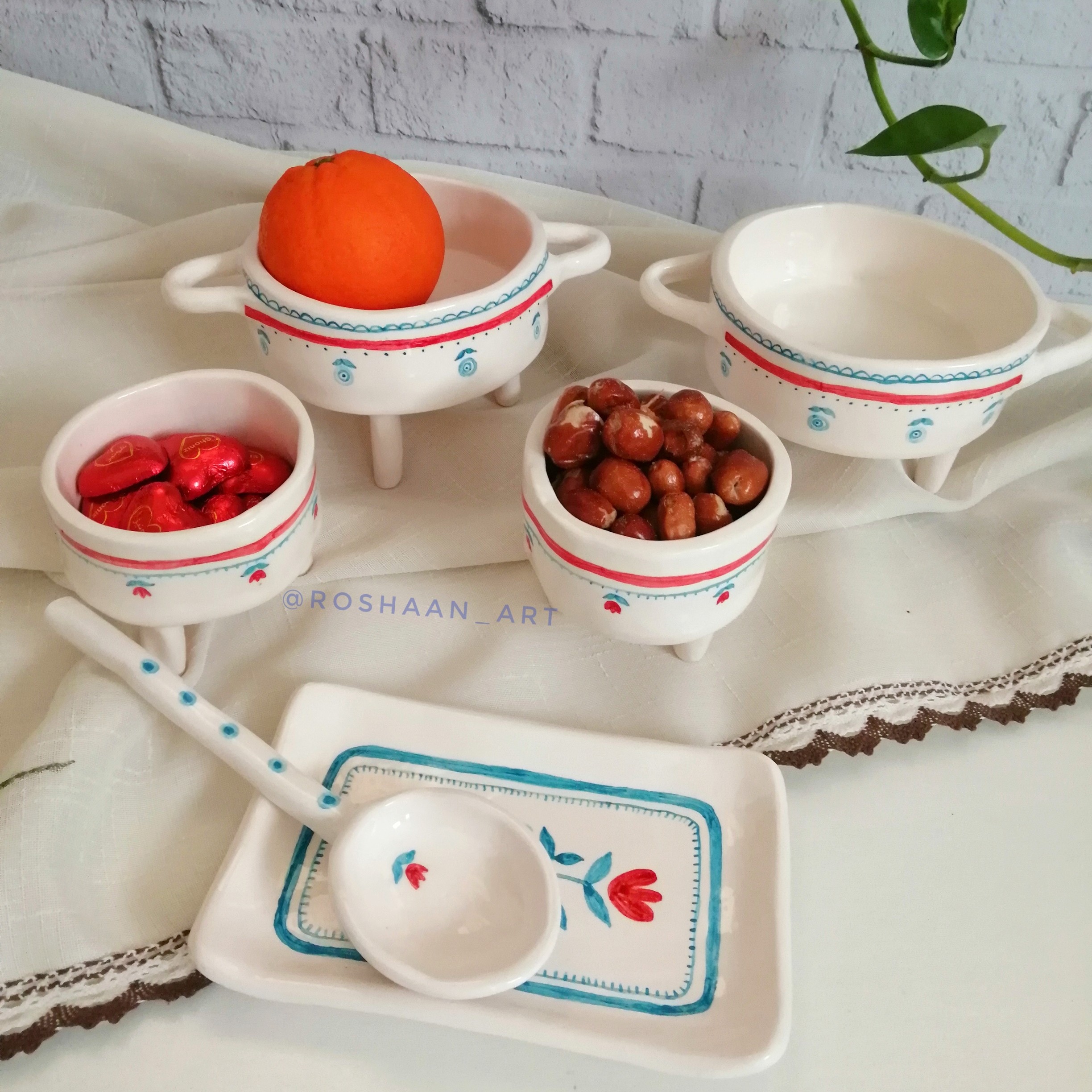 طرف ها سرامیکی و دستساز هستن ساختشون خیلی سخت هستش اما نتیجه خیلی شیرین و قشنگی داره میتونید تعداد رو کم یا زیاد کنید ظرف ها دفرمه هستن هزینه ارسال هستش