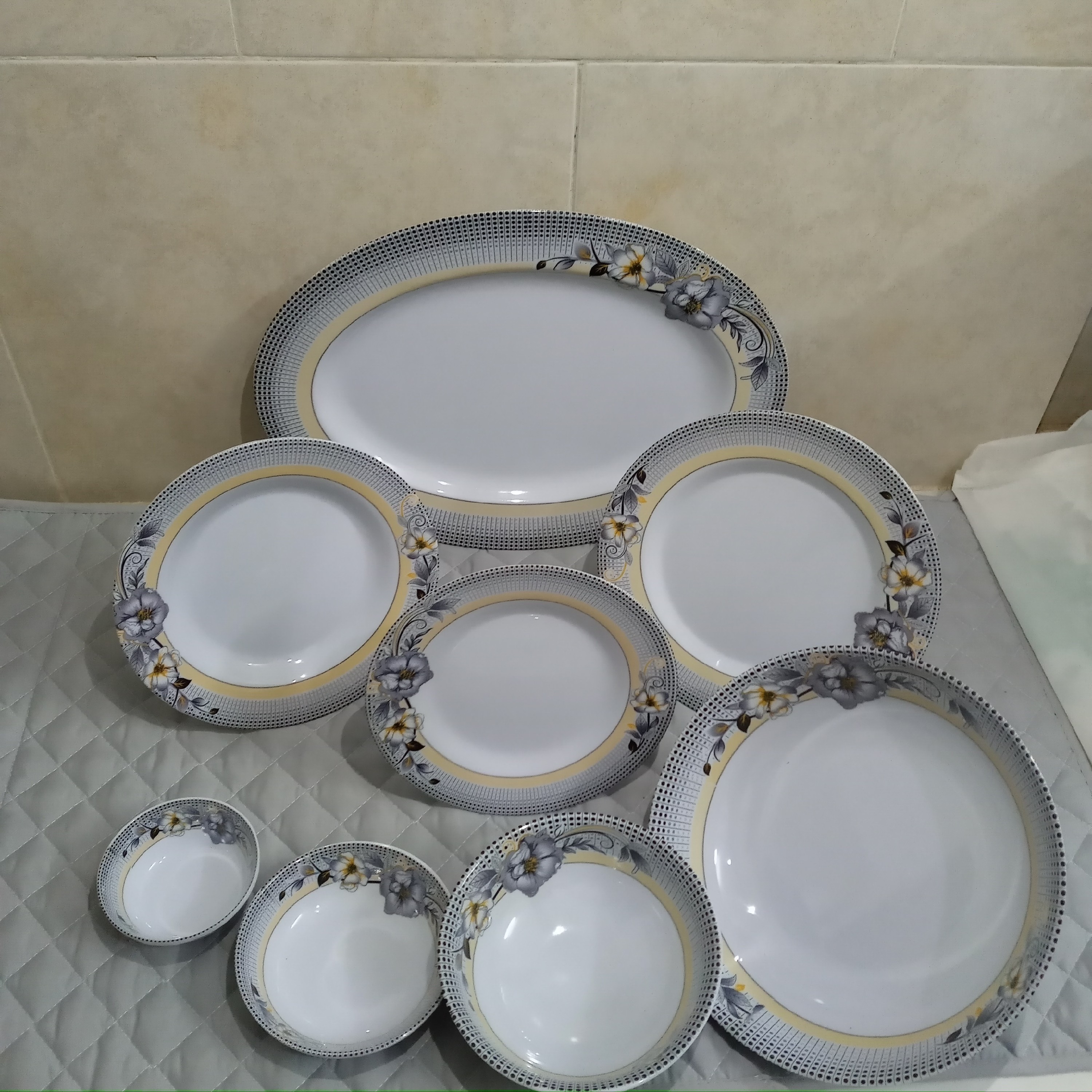 سرویس ۳۸ پارچه ملامین گرد صنایع تولیدی شیرکوه ملامین یزد دارای استاندارد مواد درجه یک رنگ طوسی مارک اصلی ملامین یزد