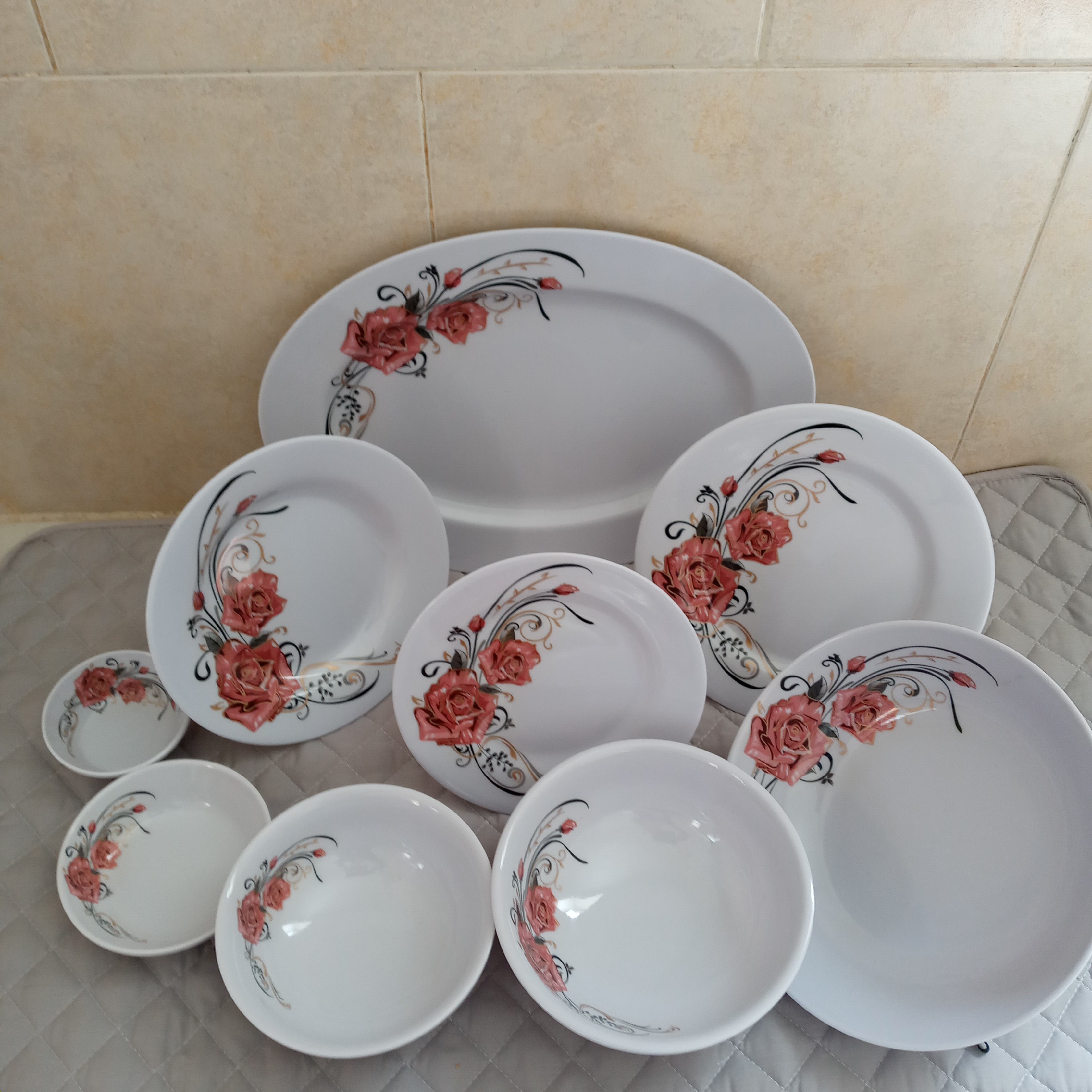 سرویس شامل ۶ عدد بشقاب برنج خوری ■ ۶ عدد بشقاب خورشت خوری ■۶ عدد بشقاب میوه خوری ■ ۶ عدد کاسه ماست خوری ■ ۶ عدد کاسه ترشی خوری ■ ۶ عدد کاسه آبگوشت خوری یک نفره ■ یک عدد کاسه آبگوشت خوری دو نفره ■یک عدد دیس برنج ■یک عدد کاسه سالاد بزرگ