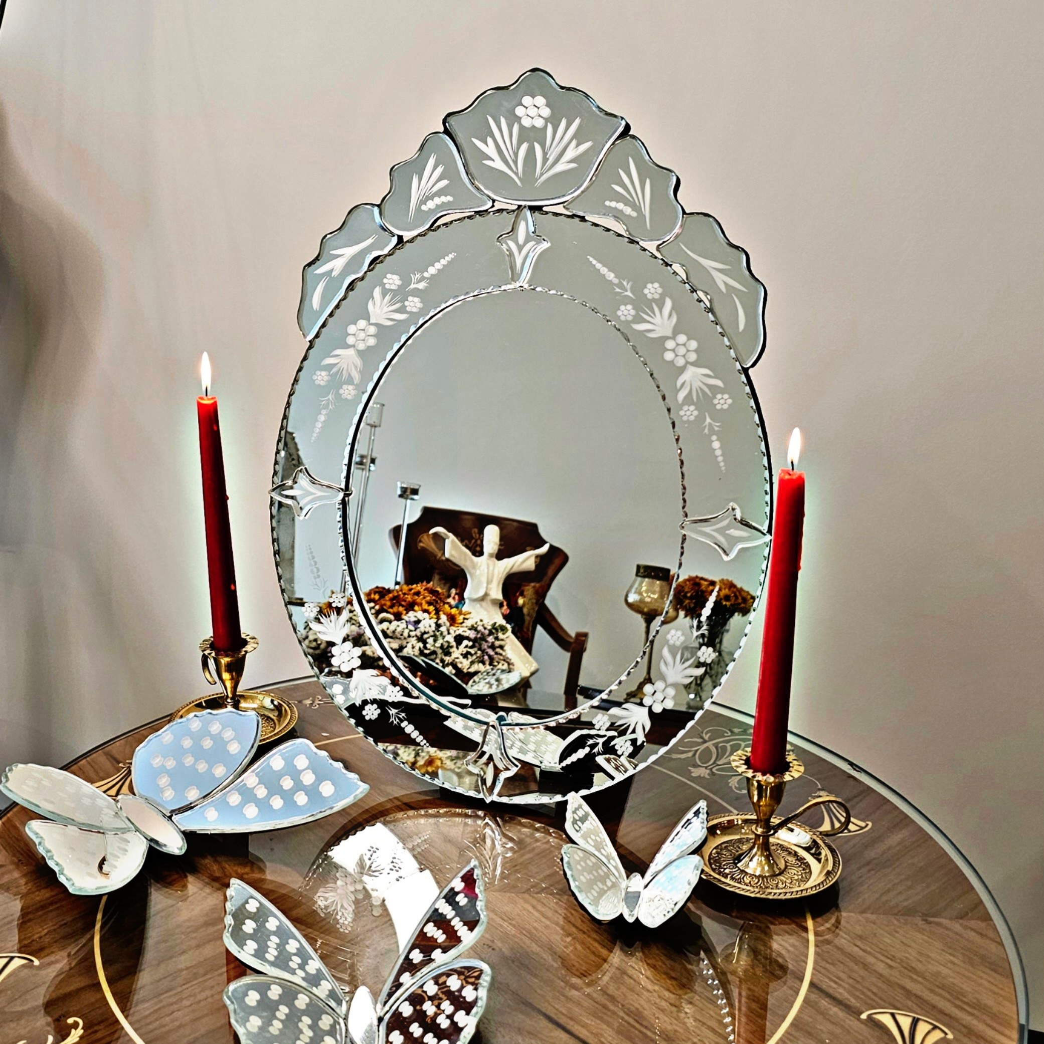 آینه ونیزی مدل بیضی ابعاد ۳۲ در ۴۵ زیبا و دکوراتیو کیفیت آینه بسیار بالا سند بلاست شده هزینه ارسال هنگام تحویل کالا از مشتری دریافت میشود.