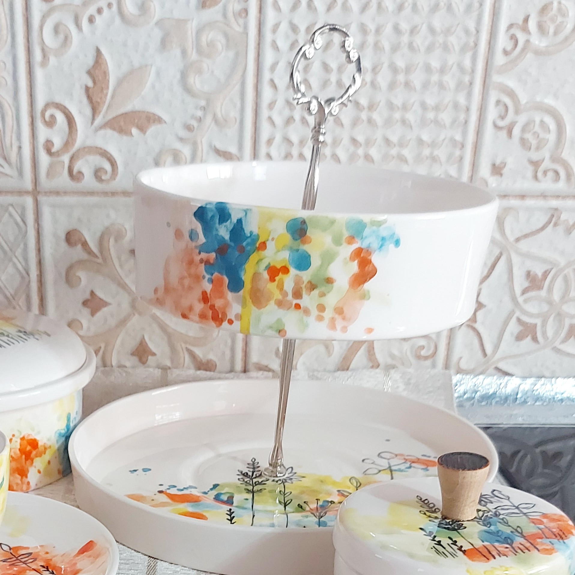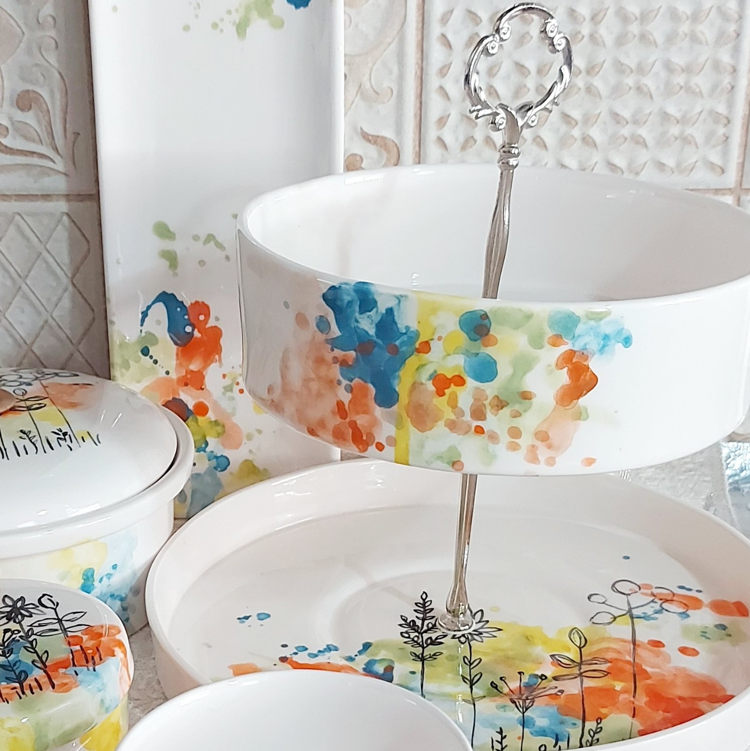 شیرینی خوری و شکلات خوری دو طبقه سرامیکی طرح آبرنگی مبلمونسرا مدل 296697