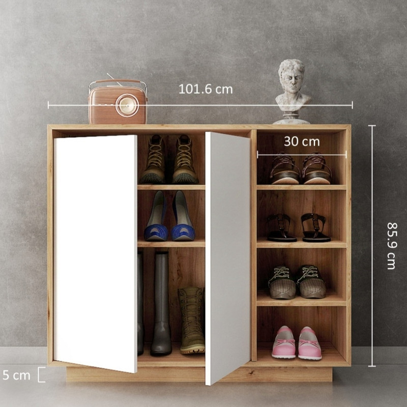 جا کفشی مدلS-14 ، یک جا کفشی مدرن می باشد که در کمال سادگی و زیبایی، با ایجاد مقدار زیادی فضای کاربردی، تمامی نیازهای شما را بابت خرید یک جا کفشی جادار و مدرن برآورده میکند. همانطور که مشاهده میکنید این محصول طبق اصول روز دکوراسیون دنیا دیزاین و طراحی گردیده است که در نوع خود کاملاً منحصر به فرد میباشد. این جا کفشی از متریال MDF درجه یک برندهای ی و ترکیهای ساخته شده است. متریال بدنه از MDF طرح چوب و نمای دربها MDF هاس مات میباشد.