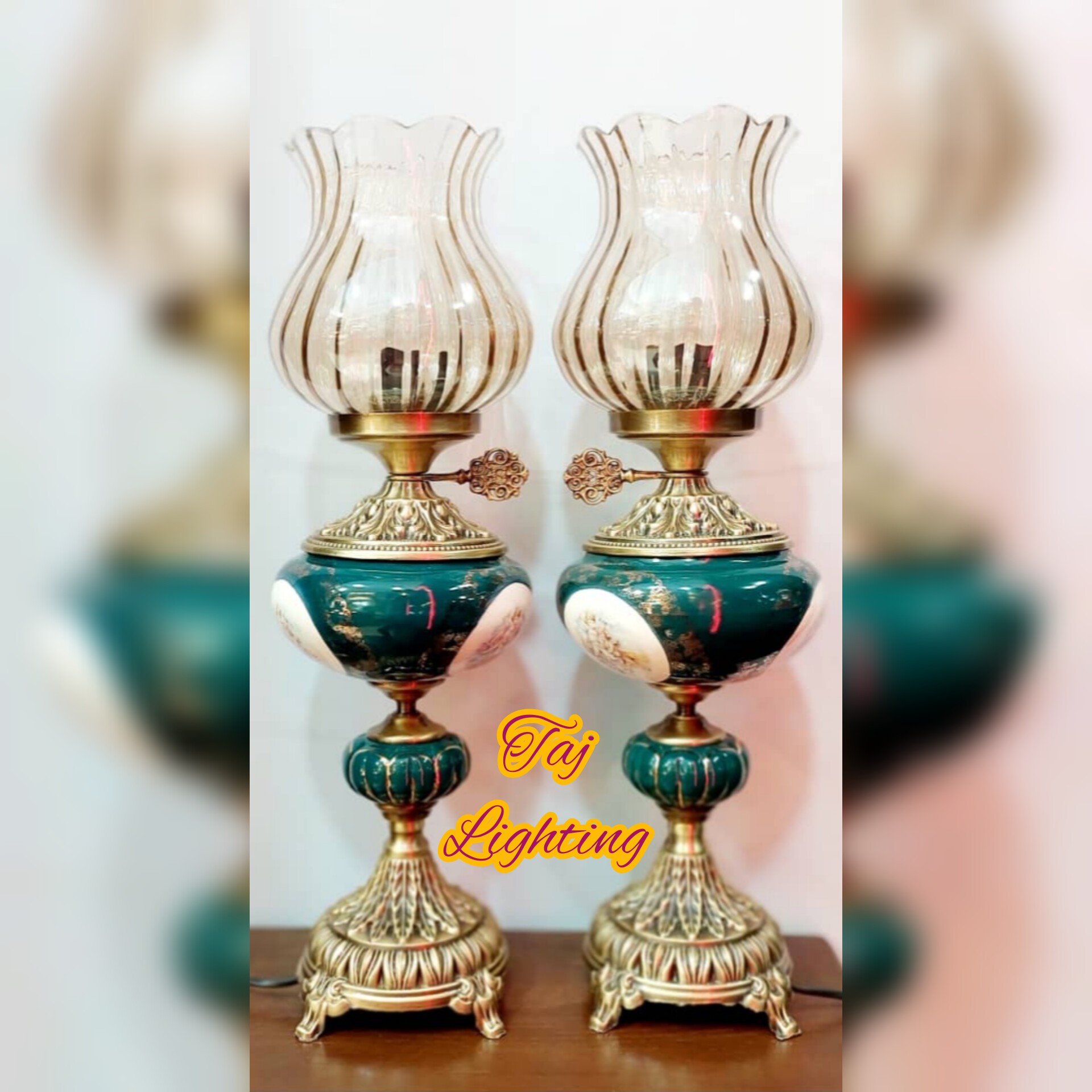 جنس وسط تنه : چینی رنگ بندی وسط تنه : زرشکی / سبز / سورمه ای / فیروزه ای / سفید جنس پایه : آلیاژ با آبکاری آنتیک جنس لاله : بلور رنگ لاله : شامپاینی 🌟قیمت درج شده قیمت هر عدد چراغ می باشد🌟