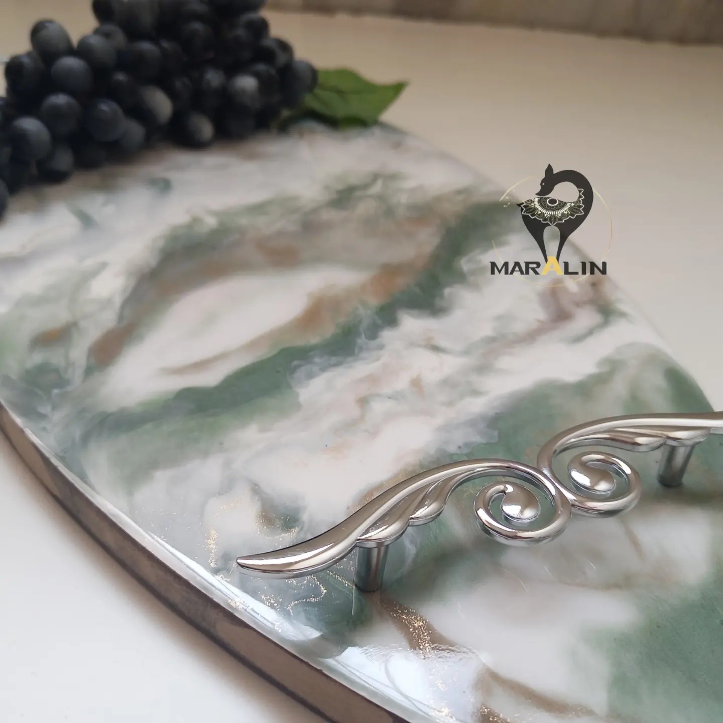 ☘️سلام☘️ سینی ماربل ،طرح سنگ مرمر سایز۳۰*۵۰به شکل برگ🌿 الهام گرفته ازسنگ طبیعی⛰️ قابل اجرا درهر رنگ سنگ واجرا روی هربیسی🔳⚫ کارشده روی mdf16،دستگیرهای استیل ،باپایه هم قابل سفارش هست✅