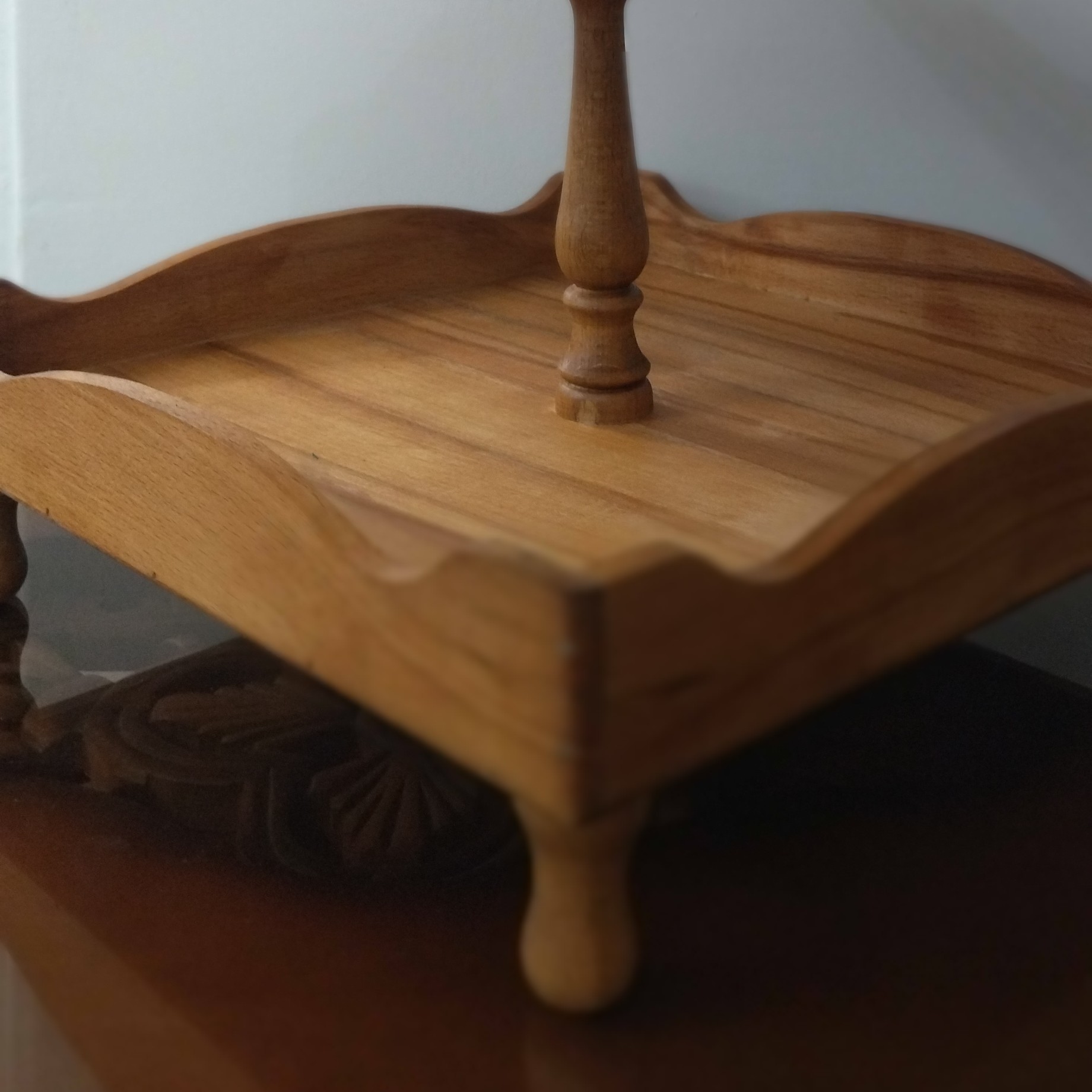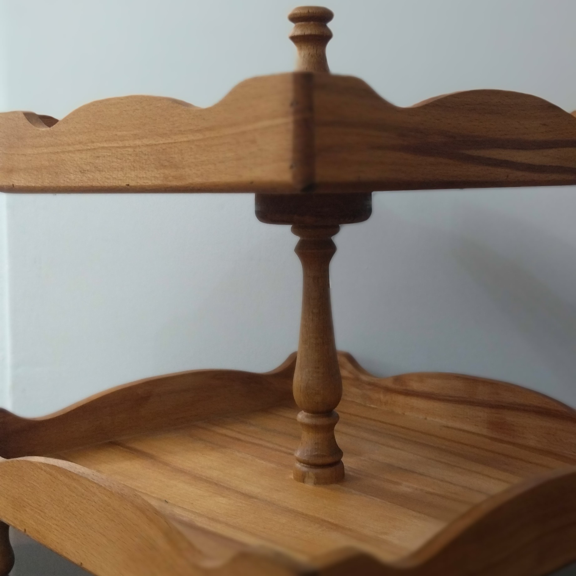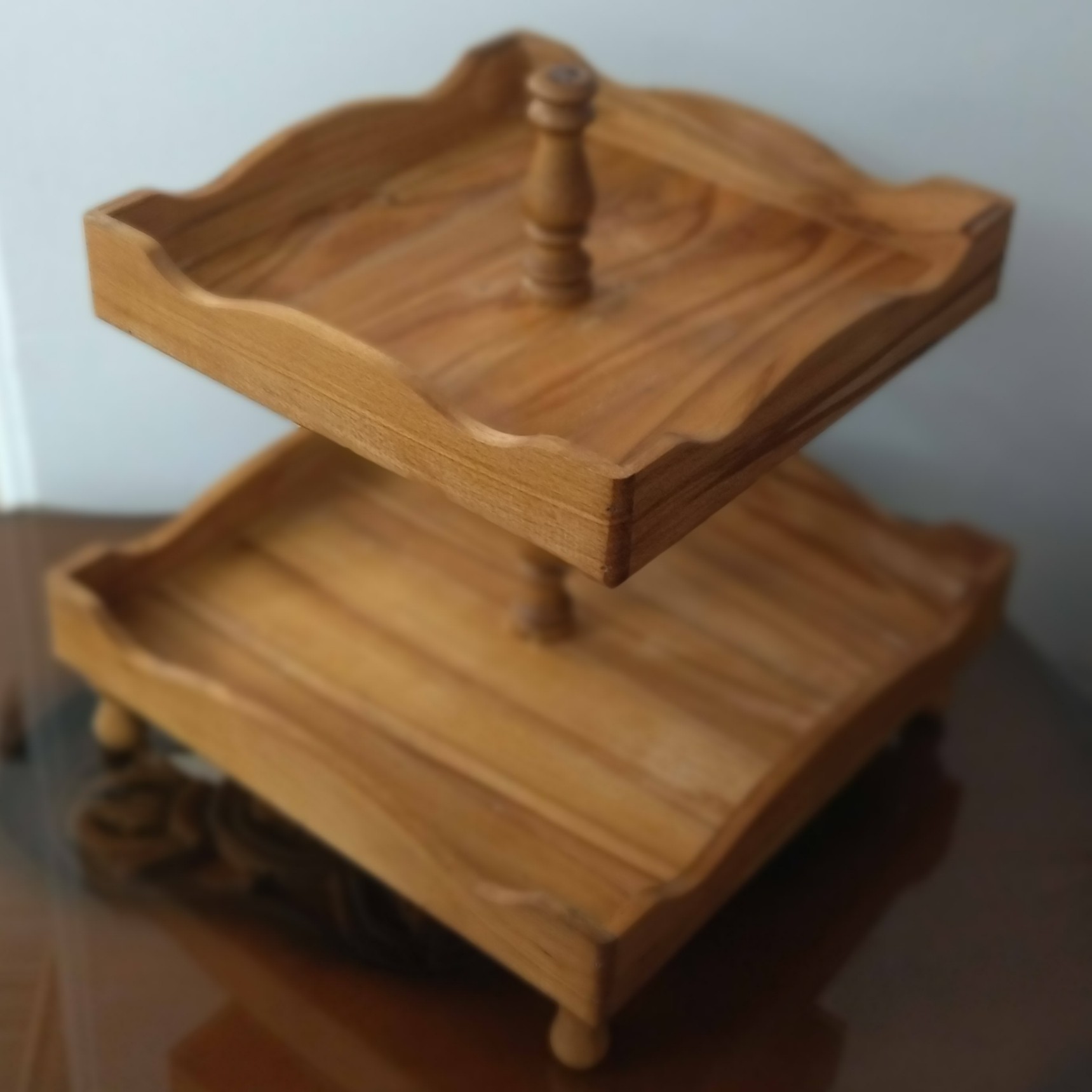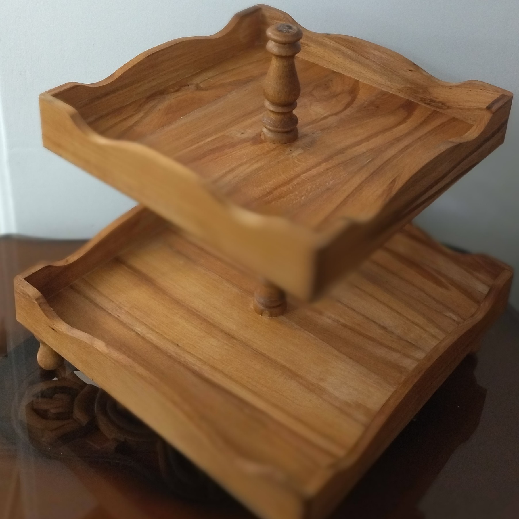 ظرف شیرینی خوری دو طبقه پایه خراطی قابل سفارش در طرحهای مختلف و اندازه دلخواه شما پوشش روغن گیاهی قابل شستشو با دست تمام کارها بعد از ثبت سفارش اماده میشود و قبل از ارسال عکس فرستاده و بعد از تایید شما ارسال میشود ترک یا دفرمگی و تیره یل روشنی در کار چوب طبیعی است