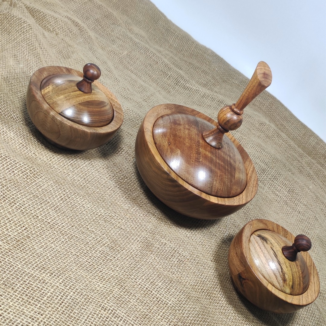 ست شکلات خوری و قندان که از چوب زیبا و بسیار مقاوم گردو ساخته شده که حتی از اون میتونید به عنوان اجیل خوری هم استفاده کنید و با روغن گیاهی همل اب گریز شده که هیچ بو و طعمی به قند و شکلات نمی ده و با خیال راحت هم میتونید ظروف رو بشورید🤩