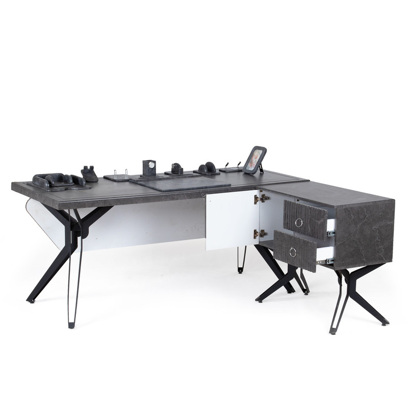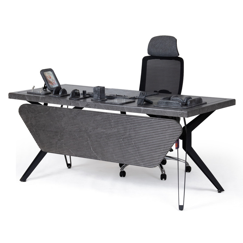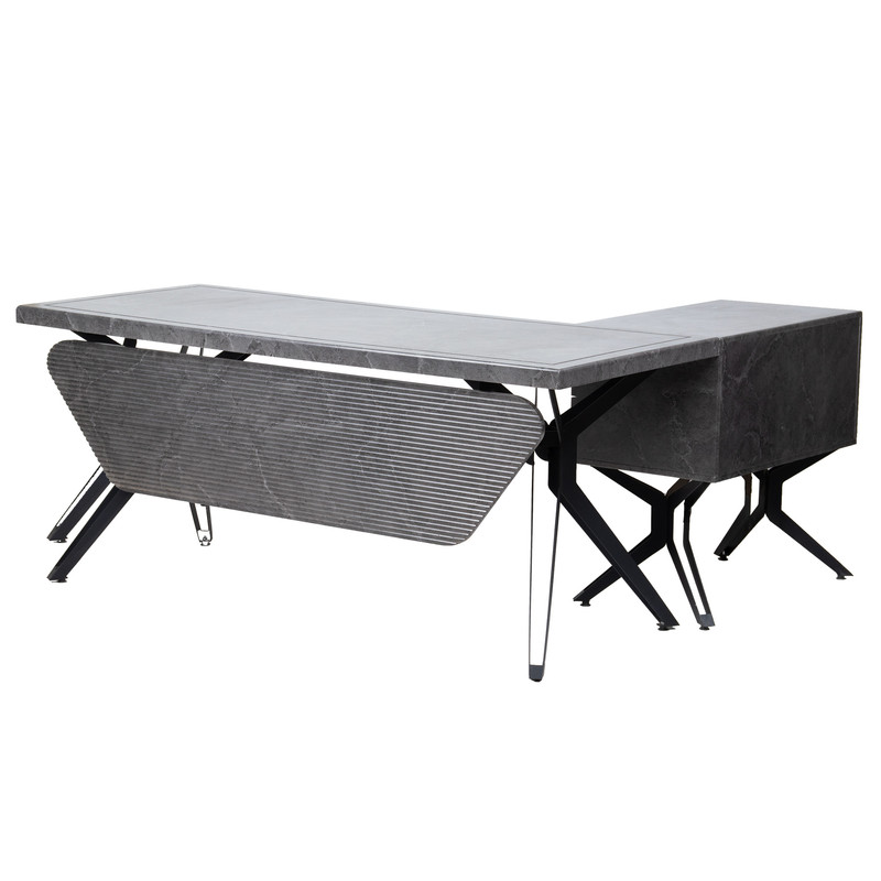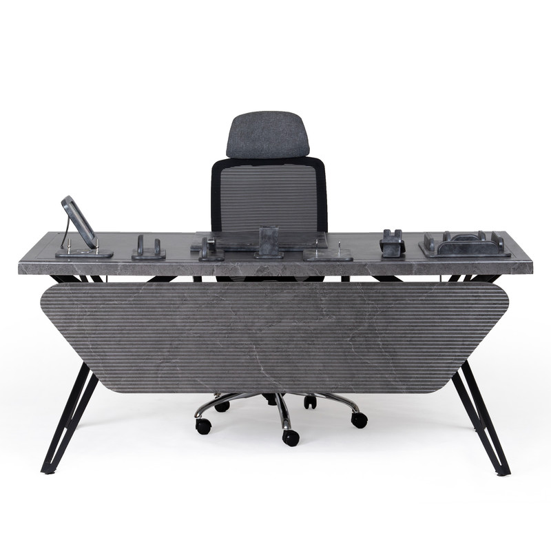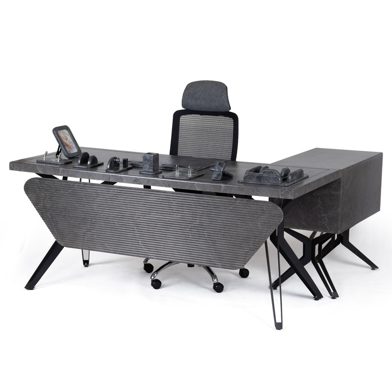 میز مدیریت کد 610 با ابعاد 180×75 سانتیمتر، گزینهای ایدهآل برای دفاتر مدیریتی و فضاهای کاری رسمی است. صفحه اصلی از MDF با ضخامت 5 سانتیمتر ساخته شده و با روکش وکیوم ضدخش و ضدآب پوشانده شده تا هم دوام بالا و هم جلوهای شیک و مدرن داشته باشد. پایههای فلزی مستحکم با ضخامت 4 میلیمتر، استحکام بالا و پایداری کامل را برای میز فراهم میکنند. طراحی پایهها به گونهای است که ضمن حفظ زیبایی، از لرزش و تکانهای احتمالی جلوگیری میکند. این میز همچنین مجهز به کنسول جانبی (المانند) است که شامل کشو و کمد برای نگهداری اسناد، لوازم اداری و وسایل شخصی میباشد. طراحی کنسول به گونهای انجام شده که هم به زیبایی دکوراسیون کمک میکند و هم فضای کار را منظمتر میسازد. ویژگیها: ابعاد: 180×75 سانتیمتر صفحه MDF با ضخامت 5 سانتیمتر و روکش وکیوم پایه فلزی مقاوم با ضخامت 4 میلیمتر کنسول جانبی با کشو و کمد جادار طراحی مدرن، بادوام و کاربردی است