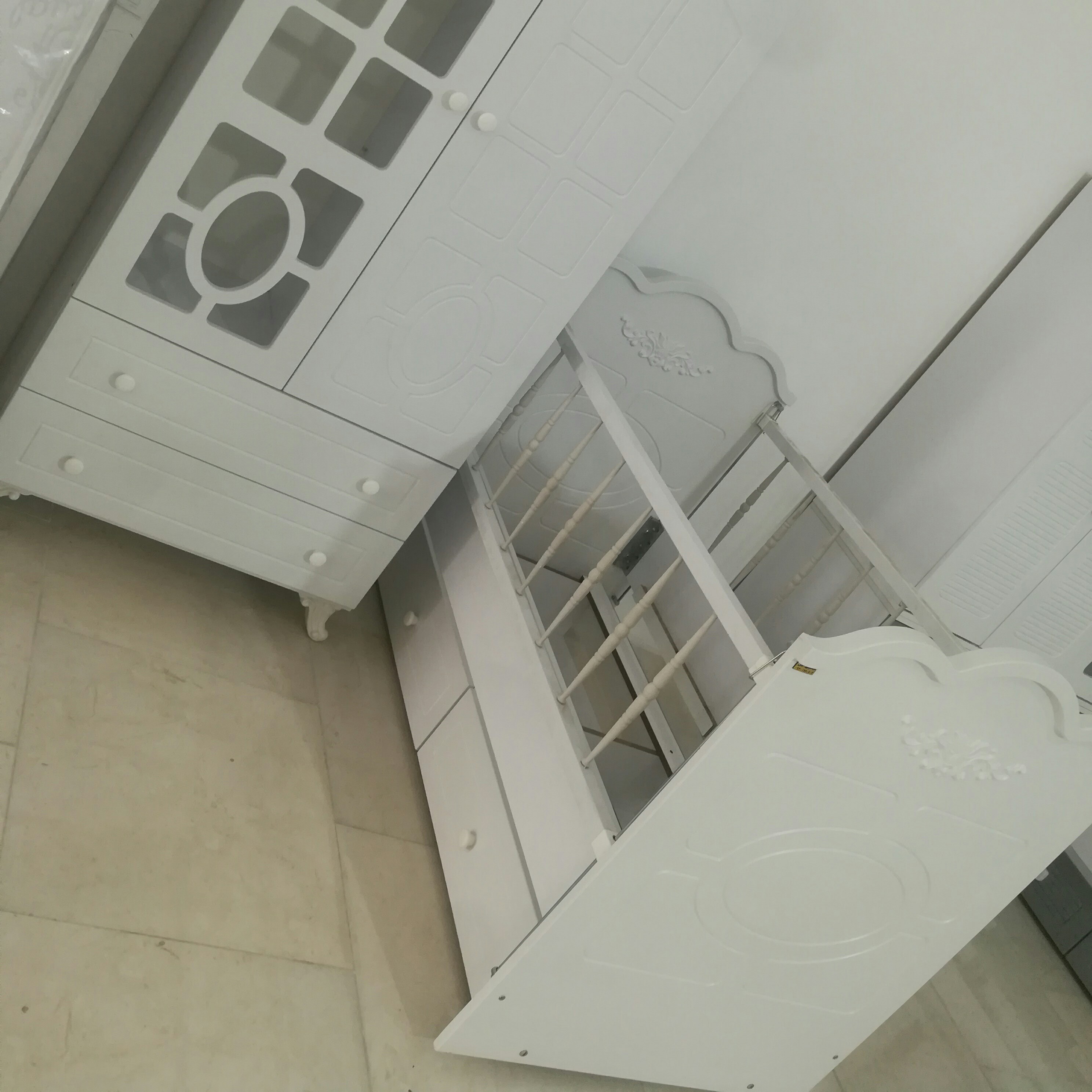 با سلام کمد دو کشو رنگ سفید تخت مناسب تا هفت سال با دو عدد کشو و کفی و حالت گهواره و هر دو طرف حفاظ آسانسوری میباشد نما ام دی اف