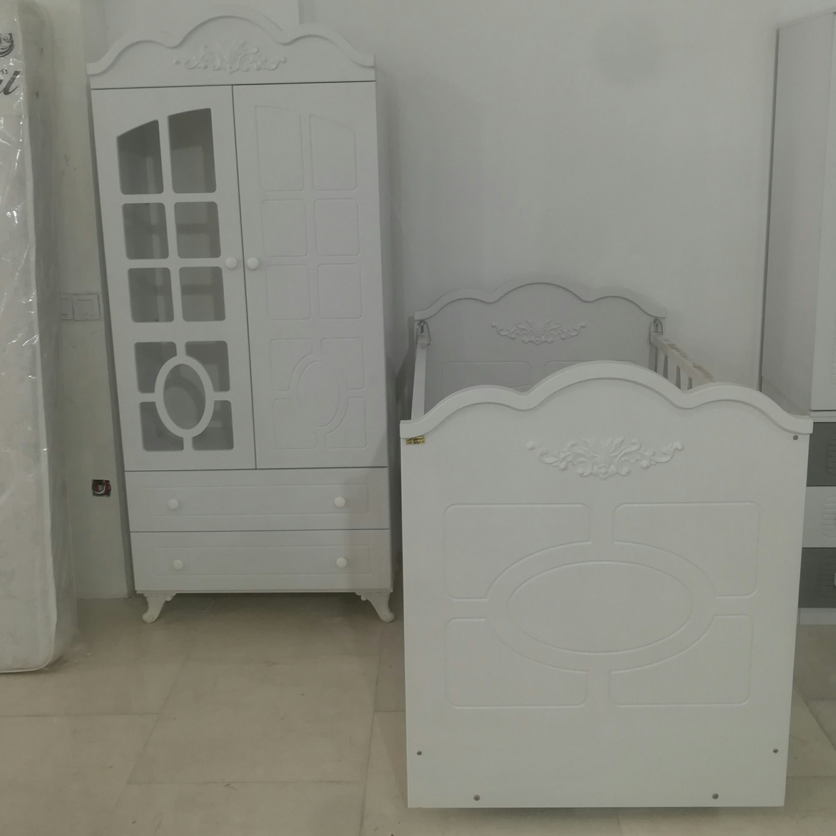 کمد بچه و تخت نوزادی سفید مبلمونسرا مدل 225336