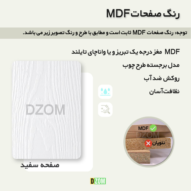 جنس صفحه MDF درجه یک طرح چوب با رویه ضد آب می باشد. زیر صفحه ام دی اف کلاف فلزی کار شده است. جهت ثبات بیشتر و تراز نمودن، محصول دارای پایه های پیچی قابل تنظیم می باشد. پایه های فلزی با مقطع جوشکاری شده و یکپارچه بدون لقی (نسبت به اتصالات پیچ و مهره) پوشش رنگ فلز: رنگ کوره ای الکتروستاتیک (یکنواخت، ضد خش و بسیار با کیفیت) محصول مونتاژ شده و آماده استفاده ارسال میگردد. طراحی مدرن