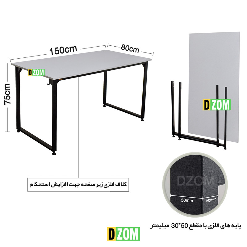 میز اداری DZom مدل مونتاژی TLD_asm_150×80_W محصولی مونتاژی، سبک، شیک و در عین حال جذاب و کارآمد از سری تولیدات میباشد. این محصول بصورت سلف اسمبل (مونتاژی) تولید شده است. این میز حمل و نقل آسان و هزینه حمل مقرون به صرفه ای دارد. این میز از پایه های فلزی با مقطع 50x30 میلیمتر و رنگ رویه الکترو با ی و دوام بالا ساخته شده است. همچنین پایه های پیچی، قابلیت تنظیم نسبت به سطح زمین را دارد تا بهترین تراز جهت جلوگیری از تکان خوردن را ایجاد نماید. صفحه میز از جنس MDF درجه یک برجسته طرح چوب به رنگ سفید می باشد. این محصول با طول 150cm، عرض 80cm و ارتفاع 75cm عرضه می شود. به این نکته توجه شود که تنوع رنگ انتخابی کالا تنها مربوط به رنگ پایه های فلزی میباشد.