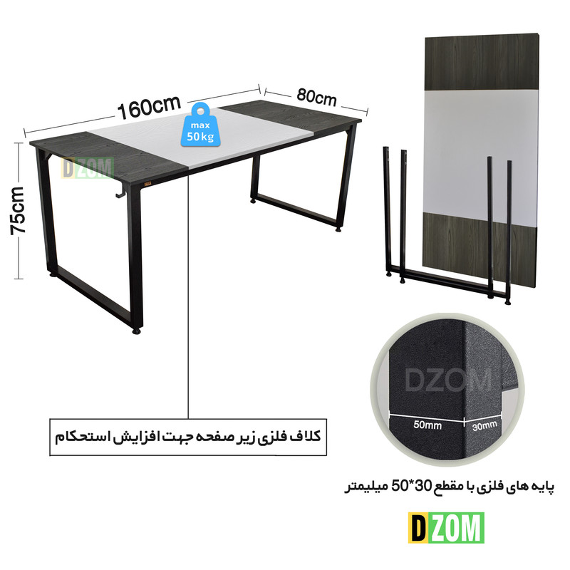 میز اداری DZom مدل مونتاژی TLD_asm_160×80_Tri_BAW محصولی مونتاژی، سبک، شیک و در عین حال جذاب و کارآمد از سری تولیدات میباشد. مشتری گرامی توجه نمایید محصولات برند (شماره ثبت 414013 اداره ثبت علائم تجاری) با کیفیت و بسته بندی اصلی تنها توسط فروشنده رسمی در دیجیکالا عرضه میشود، لطفاً از خرید کالای تقلبی از سایر فروشندگان خودداری فرمایید. این محصول بصورت سلف اسمبل (مونتاژی) تولید شده است. این میز حمل و نقل آسان و هزینه حمل مقرون به صرفه ای دارد. این میز از پایه های فلزی با مقطع 50x30 میلیمتر و رنگ رویه الکترو با ی و دوام بالا ساخته شده است. همچنین پایه های پیچی، قابلیت تنظیم نسبت به سطح زمین را دارد تا بهترین تراز جهت جلوگیری از تکان خوردن را ایجاد نماید. صفحه میز از جنس MDF درجه یک برجسته طرح چوب با ترکیبی از دو رنگ مشکی و سفید می باشد. این محصول با طول 160cm، عرض 80cm و ارتفاع 75cm عرضه می شود. به این نکته توجه شود که تنوع رنگ انتخابی کالا تنها مربوط به رنگ پایه های فلزی میباشد.