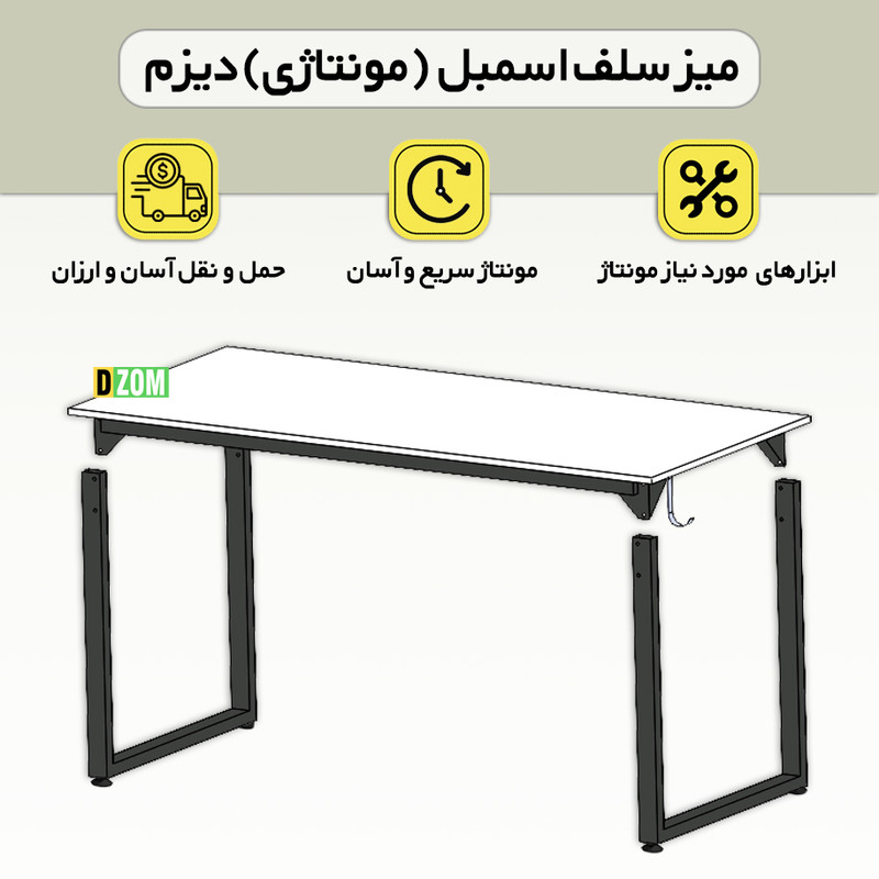 میز اداری DZom مدل مونتاژی TLD_asm_160×80_W محصولی مونتاژی، سبک، شیک و در عین حال جذاب و کارآمد از سری تولیدات میباشد. این محصول بصورت سلف اسمبل (مونتاژی) تولید شده است. این میز حمل و نقل آسان و هزینه حمل مقرون به صرفه ای دارد. این میز از پایه های فلزی با مقطع 50x30 میلیمتر و رنگ رویه الکترو با ی و دوام بالا ساخته شده است. همچنین پایه های پیچی، قابلیت تنظیم نسبت به سطح زمین را دارد تا بهترین تراز جهت جلوگیری از تکان خوردن را ایجاد نماید. صفحه میز از جنس MDF درجه یک برجسته طرح چوب به رنگ سفید می باشد. این محصول با طول 160cm، عرض 80cm و ارتفاع 75cm عرضه می شود. به این نکته توجه شود که تنوع رنگ انتخابی کالا تنها مربوط به رنگ پایه های فلزی میباشد.