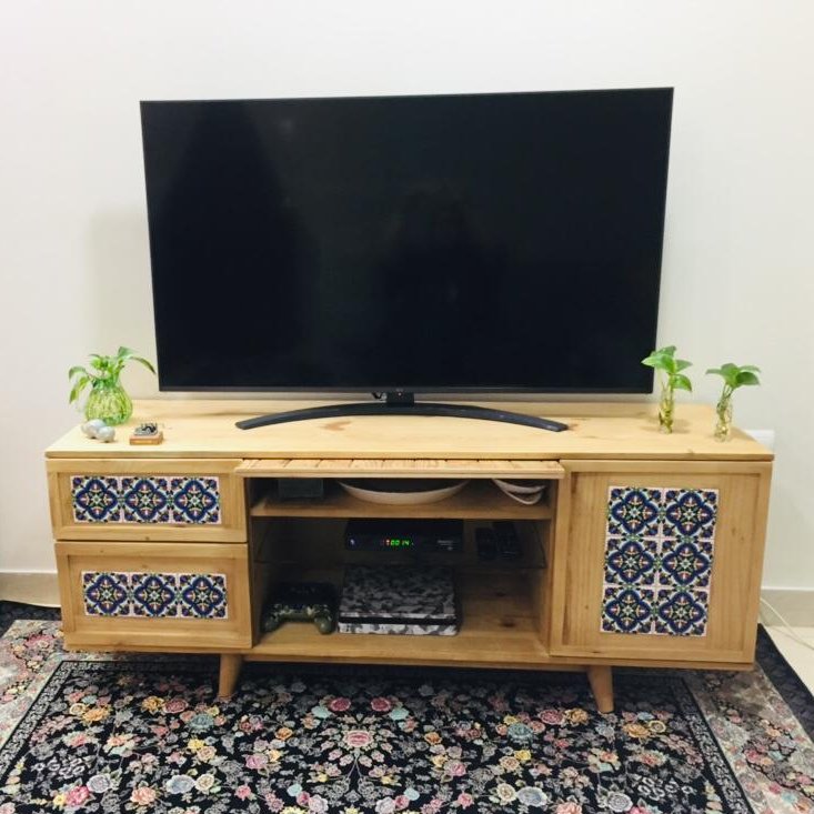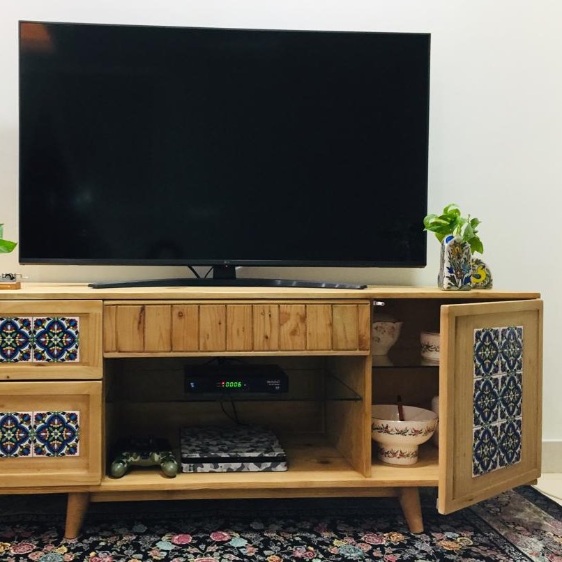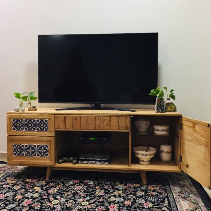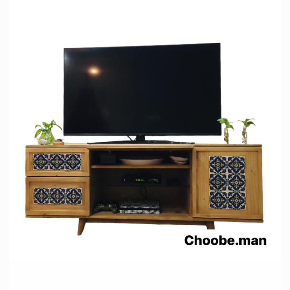 این میز دارای دو کشو جادار و یک کمد طبقه دار میباشد. همچنین در قسمت بالا محلی برای قرار گیری سیم و کابل و سه راهی و دیگر متعلقات برقی و آنتن تعبیه شده است. در قسمت وسط نیز یک طبقه شیشه ای جهت قرار گیری تجهیزات الکترونیکی بیشتر در نظر گرفته شده که قابلیت جابجایی به بالا و پایین و تنظیم ارتفاع مورد نیاز برای طبقات را دارد روی درب کمد و کشوها با سرامیک سنتی تزئین شده است و امکان تغییر رنگ سرامیک ها با توجه به سرامیک های موجود وجود دارد توضیح در مورد رنگ محصول: اجرای رنگ روشن تا تیره بر روی محصول به درخواست مشتریان محترم مقدور میباشد. بر روی این محصول علاوه بر رنگ مخصوص چوب، عملیات رنگ کاری سیلر و کیلر انجام شده و پوششی مقاوم جهت محافظت از آن در برابر هوا، رطوبت، حشرات و... ایجاد کرده است. این پوشش علاوه بر خاصیت محافظت کنندگی بالا؛ موجب استحکام بیشتر محصول شده و به زیبایی و لطافت کار می افزاید. در صورت درخواست مشتریان محترم امکان اعمال پوشش رنگ رزینی بر روی محصول وجود دارد. این پوشش با ایجاد یک لایه براق و شیشه ای بر سطح کار علاوه بر افزایش فوق العاده استحکام و مقاومت محصول در برابر نفوذ رطوبت و خوردگی توسط حشرات و پوسیدگی در مجاورت هوا و... تماس با محصول را لذت بخش و زیبایی ظاهری آن را دو چندان میکند. هزینه اجرای پوشش رزینی 35 درصد به قیمت محصول اضافه میکند با توجه به اینکه این محصول به درخواست و سفارش مشتریان محترم ساخته میشود ضمن عذرخواهی امکان لغو سفارش وجود ندارد