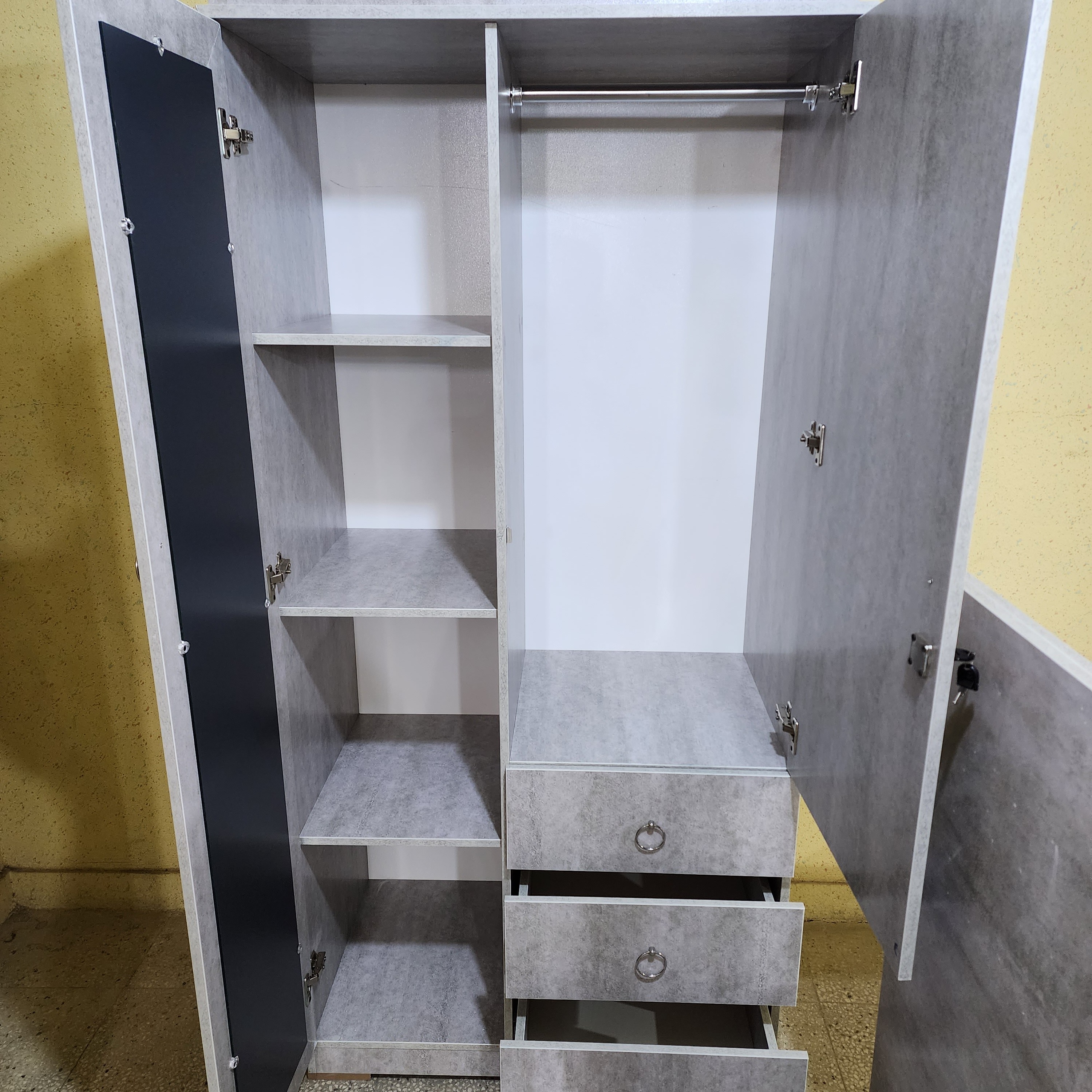 کمد لباسی وکیوم آینه دار قدی دارای طبقه بندی و رگال لولا پمپی آرام بند ریل سه زمانه نوار پی ویسی استفاده از یراق آلات درجه یک دارای ۱۲ماه گارانتی