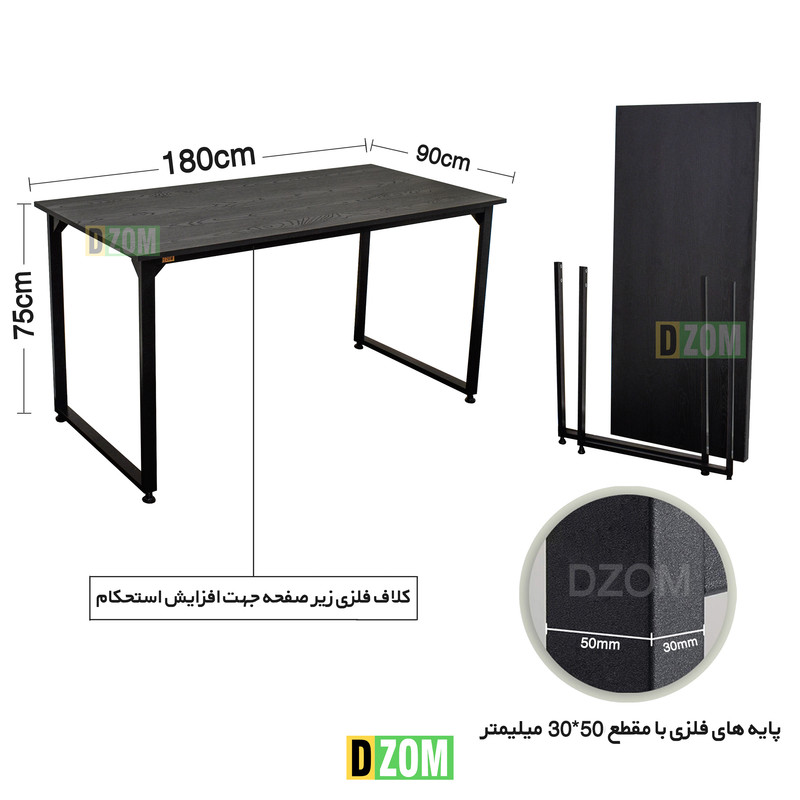 میز جلسه DZom مدل مونتاژی TLD_asm_180×90_B محصولی مونتاژی، سبک، شیک و در عین حال جذاب و کارآمد از سری تولیدات میباشد. این محصول بصورت سلف اسمبل (مونتاژی) تولید شده است. این میز حمل و نقل آسان و هزینه حمل مقرون به صرفه ای دارد. این میز از پایه های فلزی با مقطع 50x30 میلیمتر و رنگ رویه الکترو با ی و دوام بالا ساخته شده است. همچنین پایه های پیچی، قابلیت تنظیم نسبت به سطح زمین را دارد تا بهترین تراز جهت جلوگیری از تکان خوردن را ایجاد نماید. صفحه میز از جنس MDF درجه یک برجسته طرح چوب و به رنگ مشکی می باشد. این محصول با طول 180cm، عرض 90cm و ارتفاع 75cm عرضه می شود. به این نکته توجه شود که تنوع رنگ انتخابی کالا تنها مربوط به رنگ پایه های فلزی میباشد.