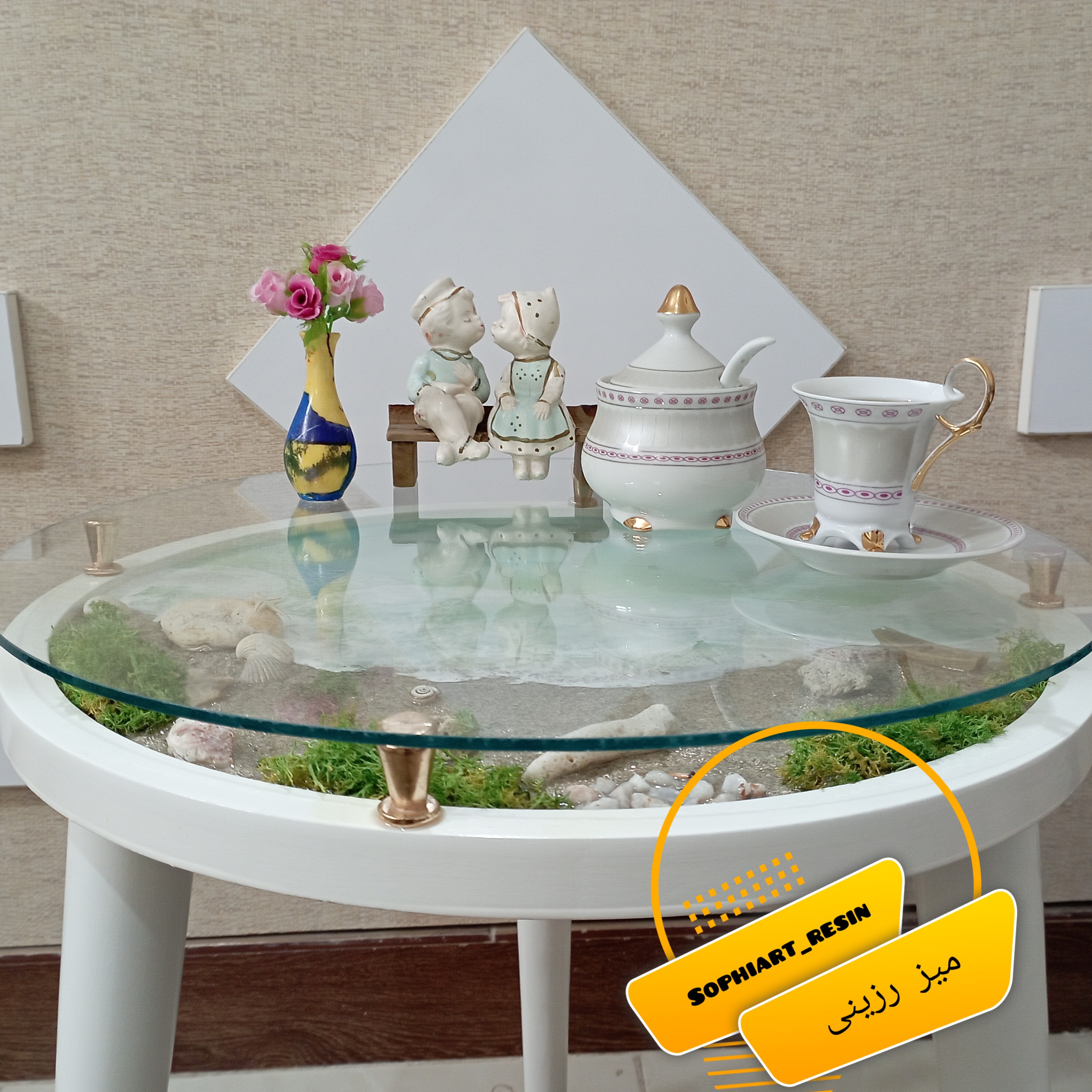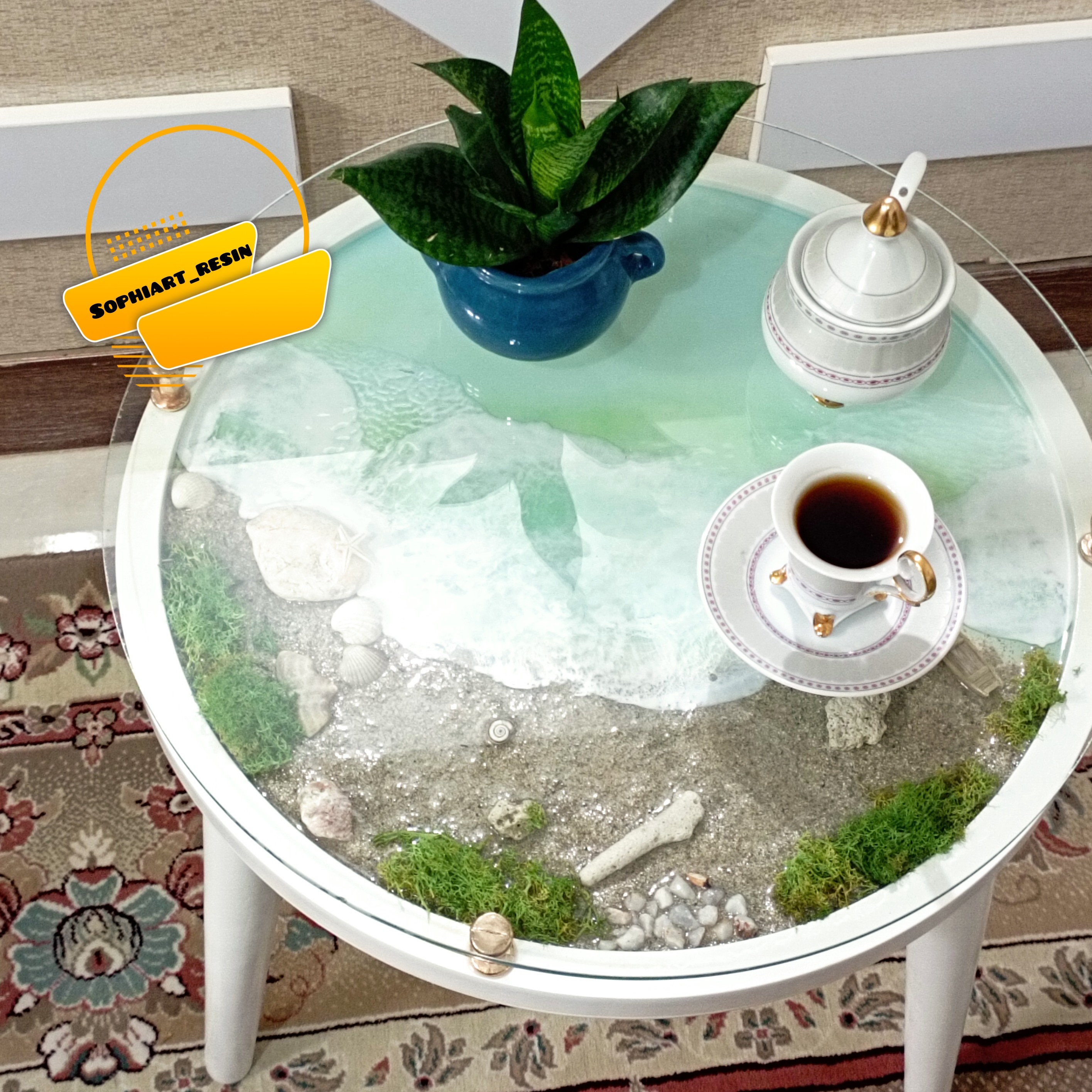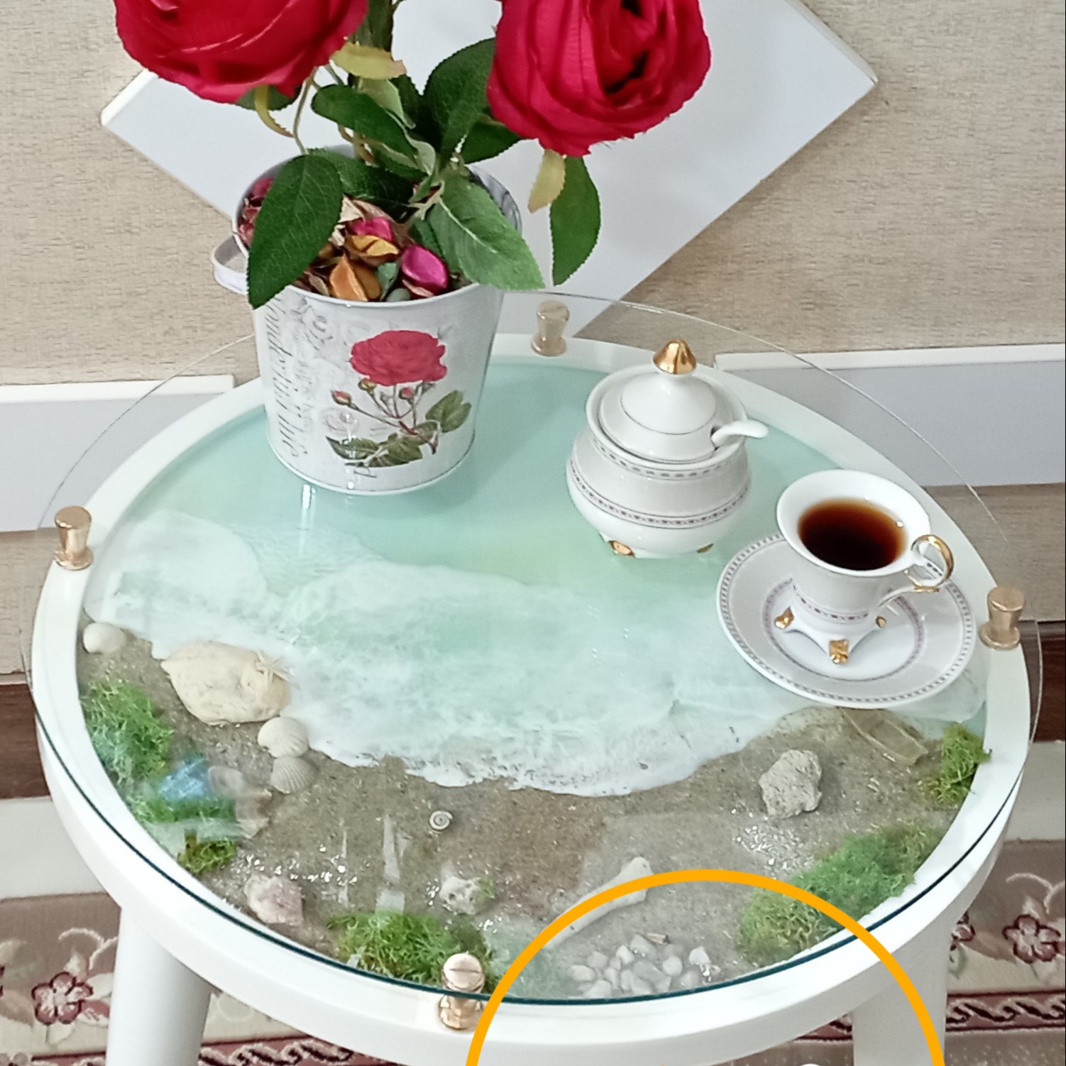 میز عسلی رزینی طرح دریا قطر ۴۵ سانت ارتفاع پایه ها ۴۵ سانت شیشه خور کار شده با اکسسوری های طبیعی دریا
