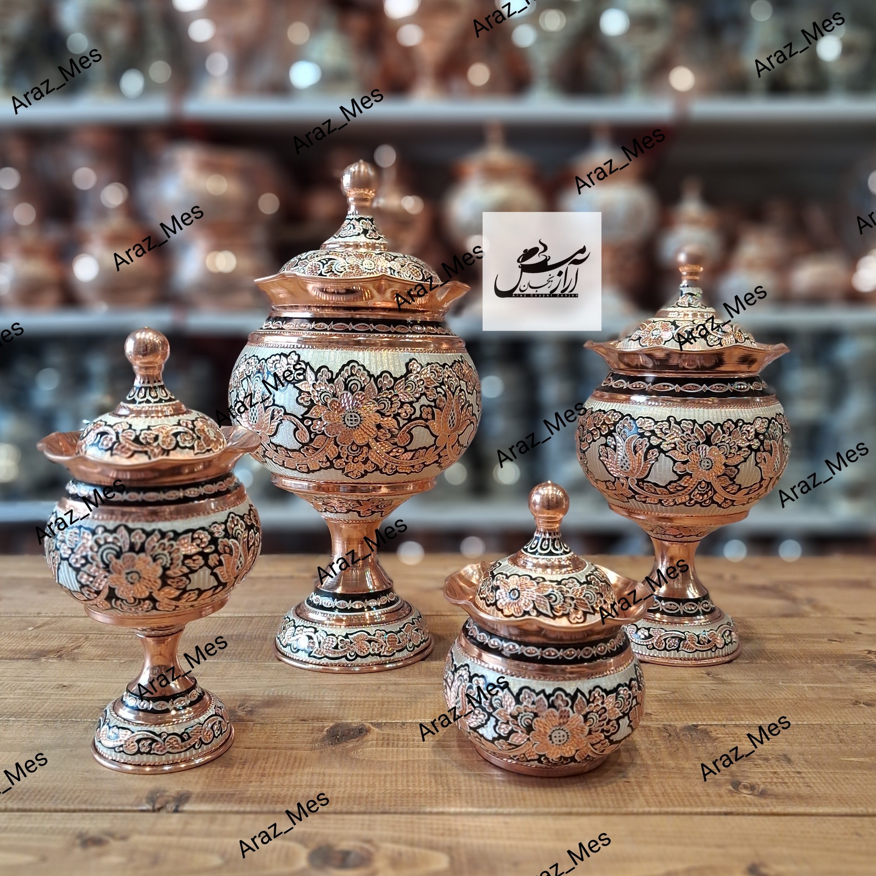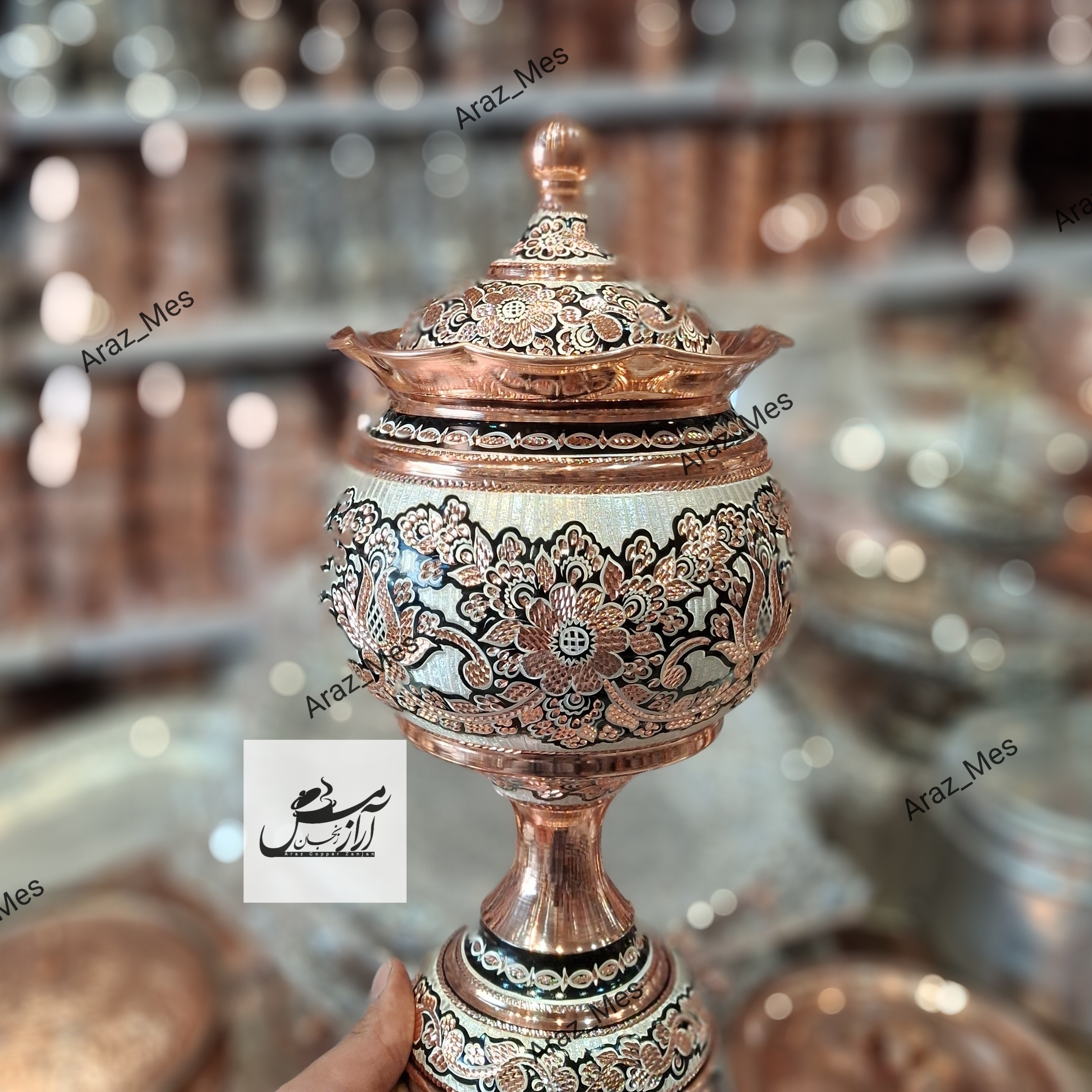 آجیل خوری مسی نقره کوب مسی لب چین نانودرجه یک پایه دار سایز بزرگ الماس تراش مبلمونسرا مدل 264740
