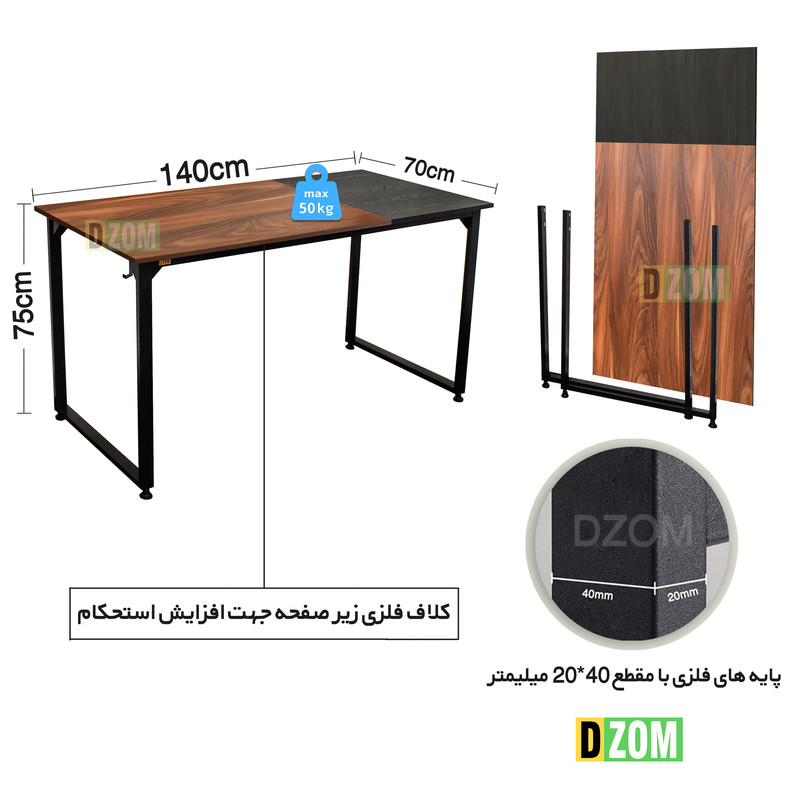 میز کامپیوتر DZom مدل مونتاژی TLD_asm_140×70_Di_BABRN محصولی مونتاژی، سبک، شیک و در عین حال جذاب و کارآمد از سری تولیدات میباشد. این محصول بصورت سلف اسمبل (مونتاژی) تولید شده است. این میز حمل و نقل آسان و هزینه حمل مقرون به صرفه ای دارد. این میز از پایه های فلزی با مقطع 40x20 میلیمتر و رنگ رویه الکترو با ی و دوام بالا ساخته شده است. همچنین پایه های پیچی، قابلیت تنظیم نسبت به سطح زمین را دارد تا بهترین تراز جهت جلوگیری از تکان خوردن را ایجاد نماید. صفحه میز از جنس MDF درجه یک برجسته طرح چوب و ترکیبی از دو رنگ مشکی و قهوه ای می باشد. این محصول با طول 140cm، عرض 70cm و ارتفاع 75cm عرضه می شود. به این نکته توجه شود که تنوع رنگ انتخابی کالا تنها مربوط به رنگ پایه های فلزی میباشد.