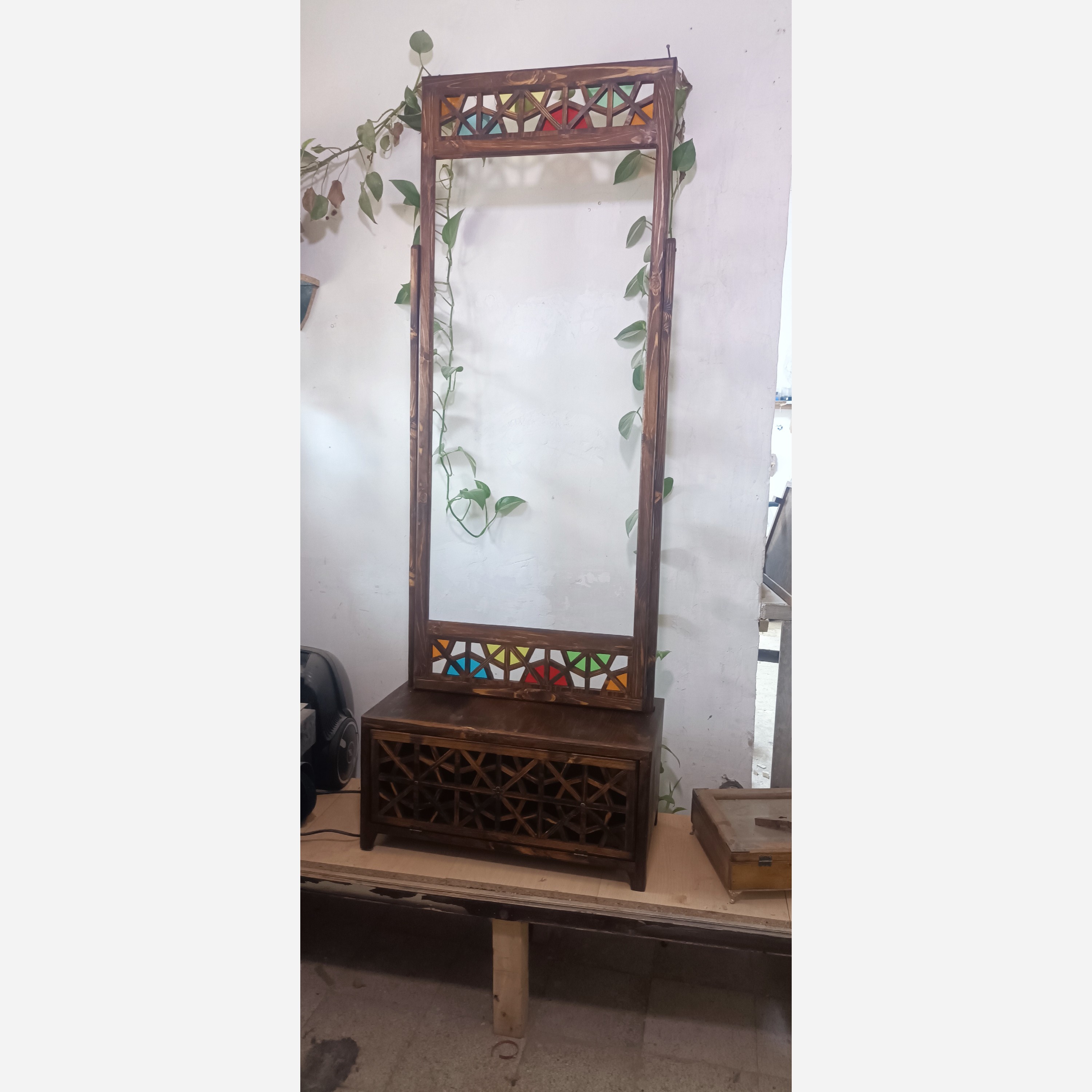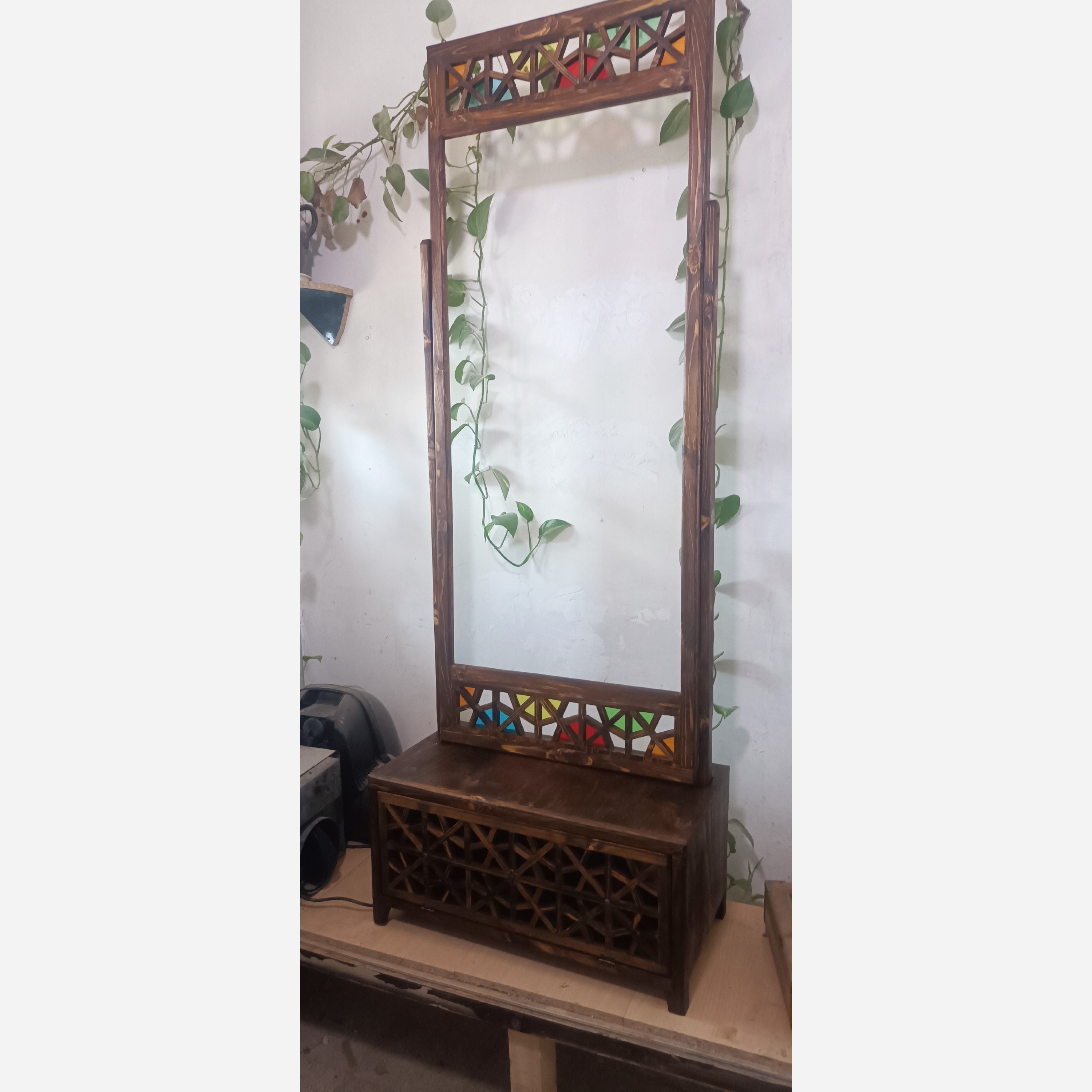 قاب آینه طرح گره چینی ساخته شده از چوب نراد سطح کارسمباده خورده صاف به گونه ای که طرح چوب کاملا نمایان است و کنسول سنگین و محکم که قاب آینه روی آن توسط دو عدد پایه چوبی ثابت میشود