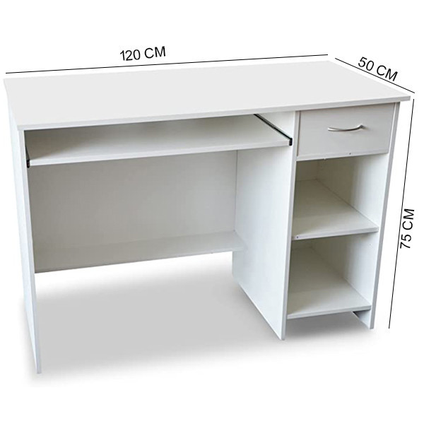 میز کامپیوتر با ابعاد طول 120 و عرض 50 و ارتفاع 75 است با کشو مجزا و محل قرار دادن کیبوردمیباشد.و جنس چوب نئوپان روکش ملامینه ضد خش فومنات پویا درجه یک و ر پی وی سی با کیفیت است .