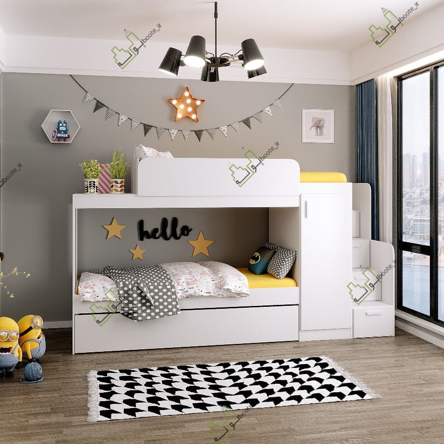 تخت دو طبقه همراه با طراحی تخت برای مهمان .بسیار جا دار کشو های امن و راحت .یک عدد کمد جادار هم دارد