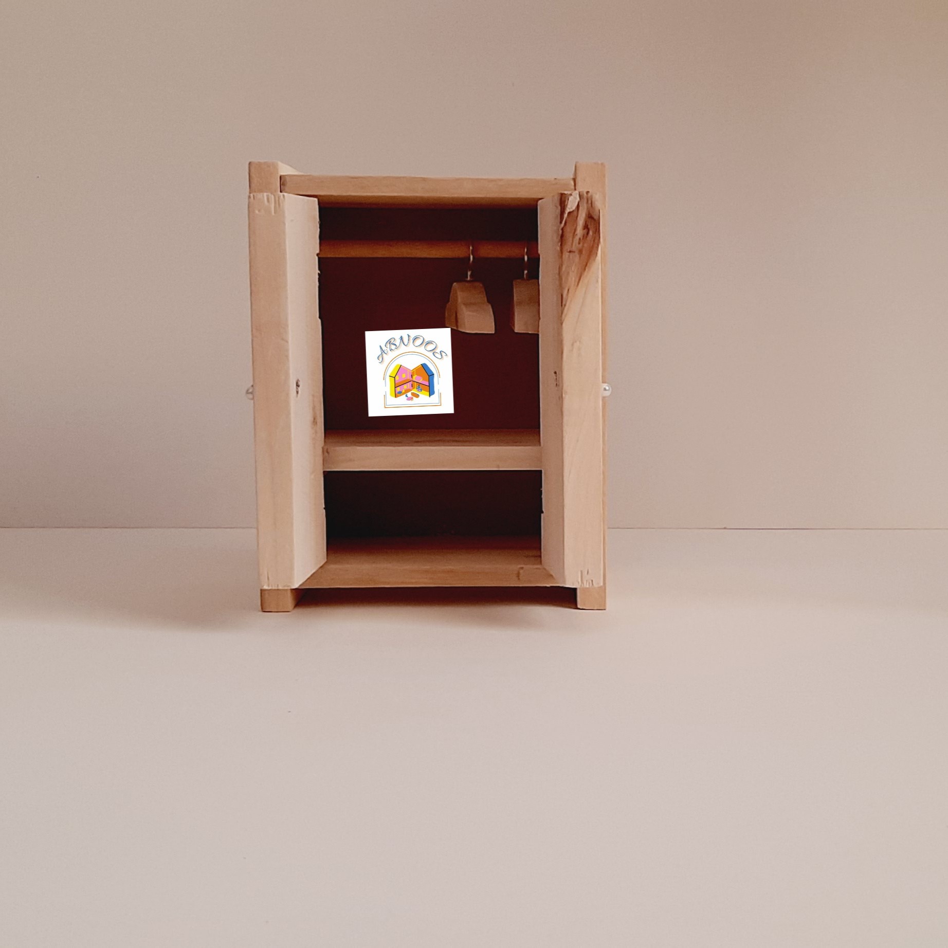 کمد لباس چوبی به همراه دو عدد چوب لباسی ساخته شده از چوب سپیدار خود رنگ مناسب بازی ارتفاع ۲۰سانت