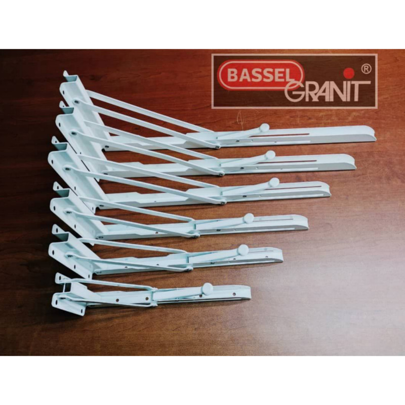 گونیا تاشو قفل دار یراقی کاربردی است که با استفاده از پیچ به دیوار نصب می گردد و صفحه ام دی اف و یا چوب بر روی آن قرار می گیرد. از مزایای این مدل گونیا تاشو ضامن دار باسل گرانيت آن است که در صورت عدم نیاز به میز می توانید به راحتی آن را جمع نمایید. از این مدل گونیا تاشو باسل گرانيت می توانید برای صفحاتی تا طول 150 سانتی متر و عرض 30الی 35 سانتی متر استفاده کنید. طول گونیا قفل دار حاضر 30 سانتیمتر می باشد.