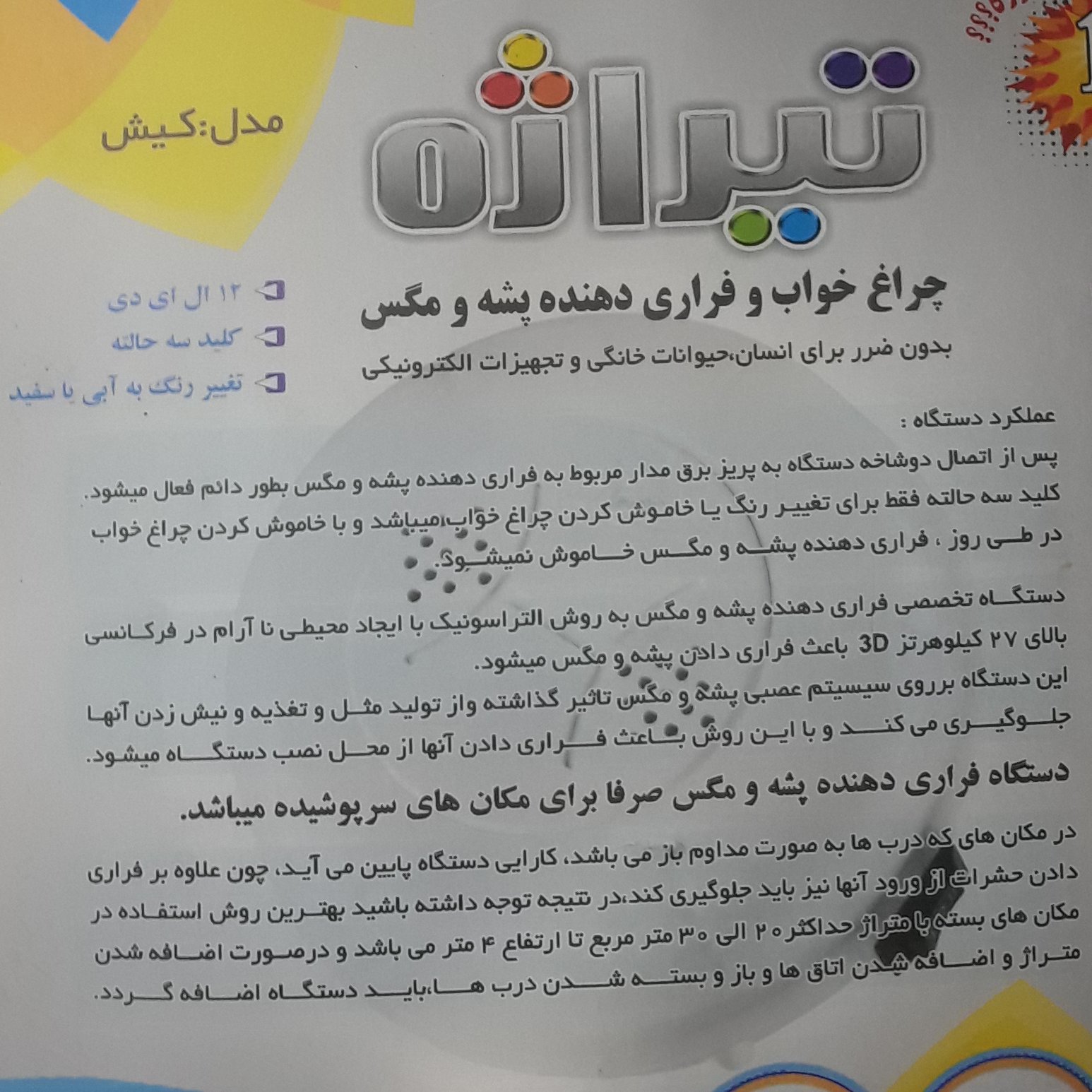حشره گش و چراغ خواب تیراژه که علاوه بر داشتن چراغ خواب ملایم فراری دهنده پشته و مگس هم میباشد
