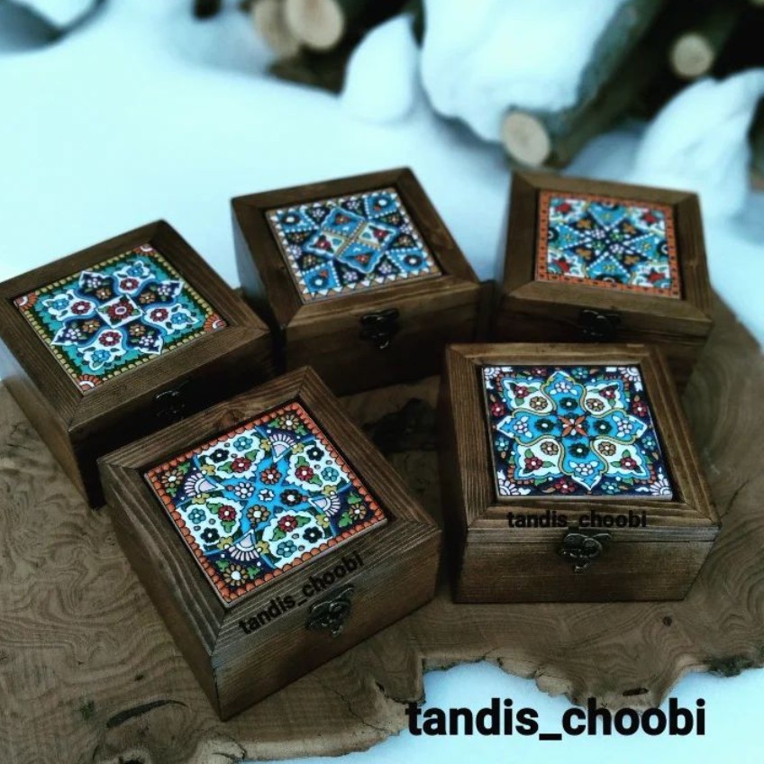 صندوقچه چوبی جواهرات تلفیق زیبای میناکاری سفال و چوب دکوری و کاربردی ، طرح متنوع