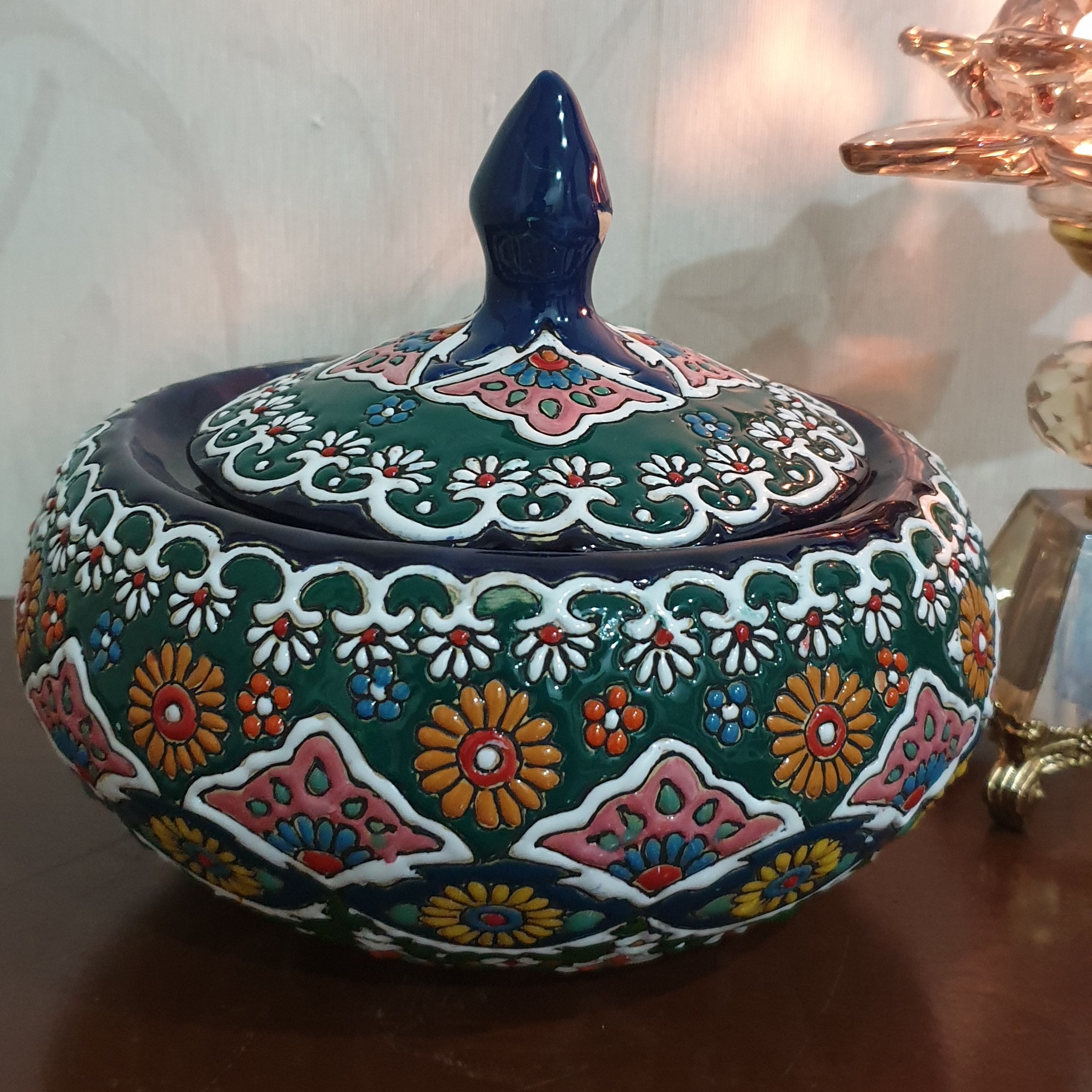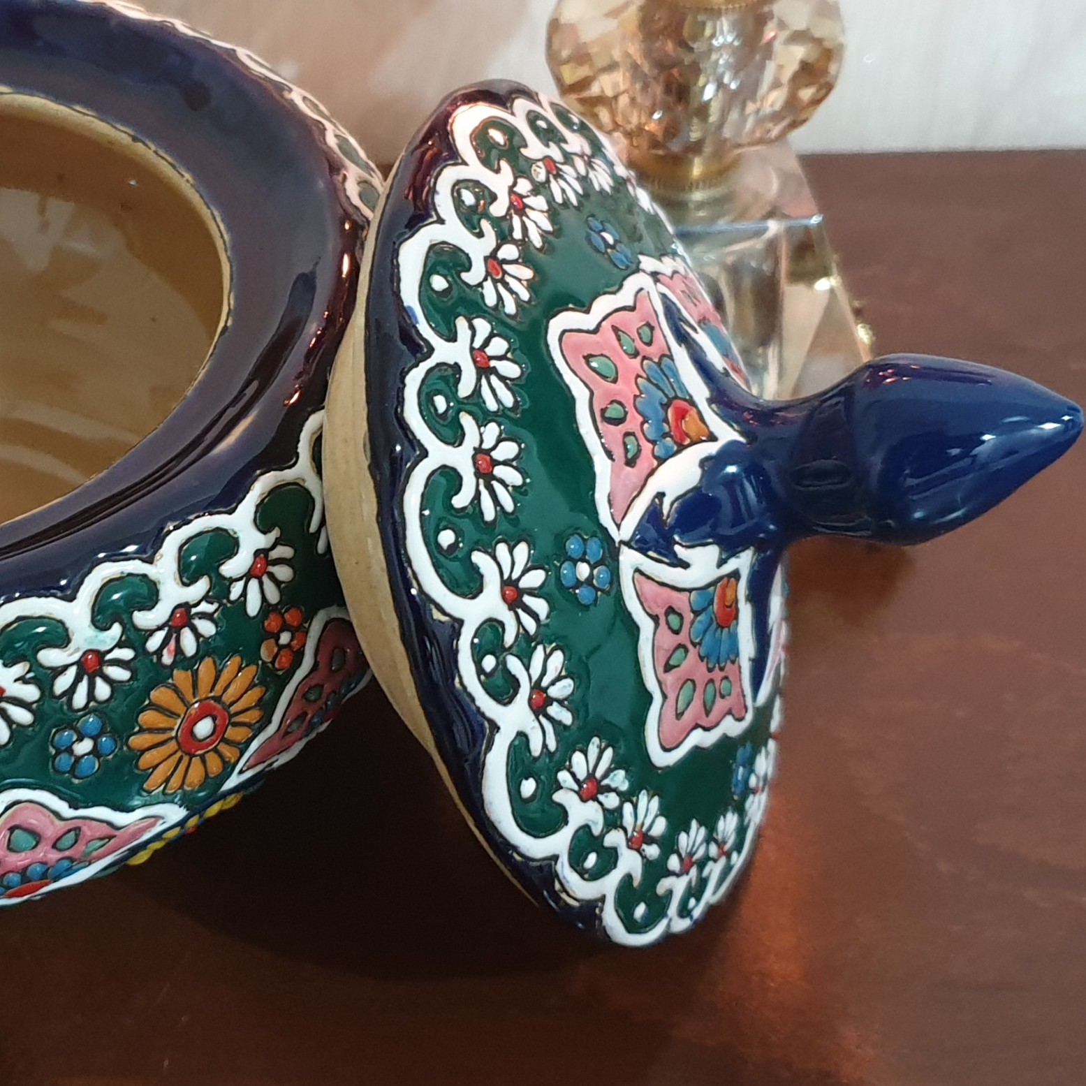شکلاتخوری بدون پایه سفالی میناکاری ارتفاع ۱۷ سانت قطر شکم ۱۵سانت قابل سفارش با رنگ دلخواه قابل استفاده و شستشو