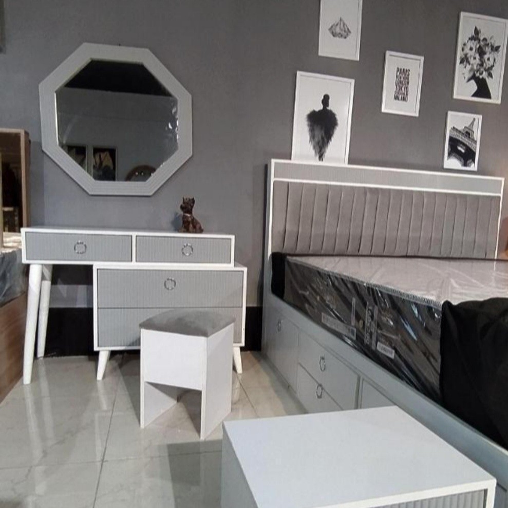 سرویس خواب دونفره تخت عرض ۱۶۰ زیر تخت باکس دار میزآرایش پاتختی ۲ عدد صندلی آینه