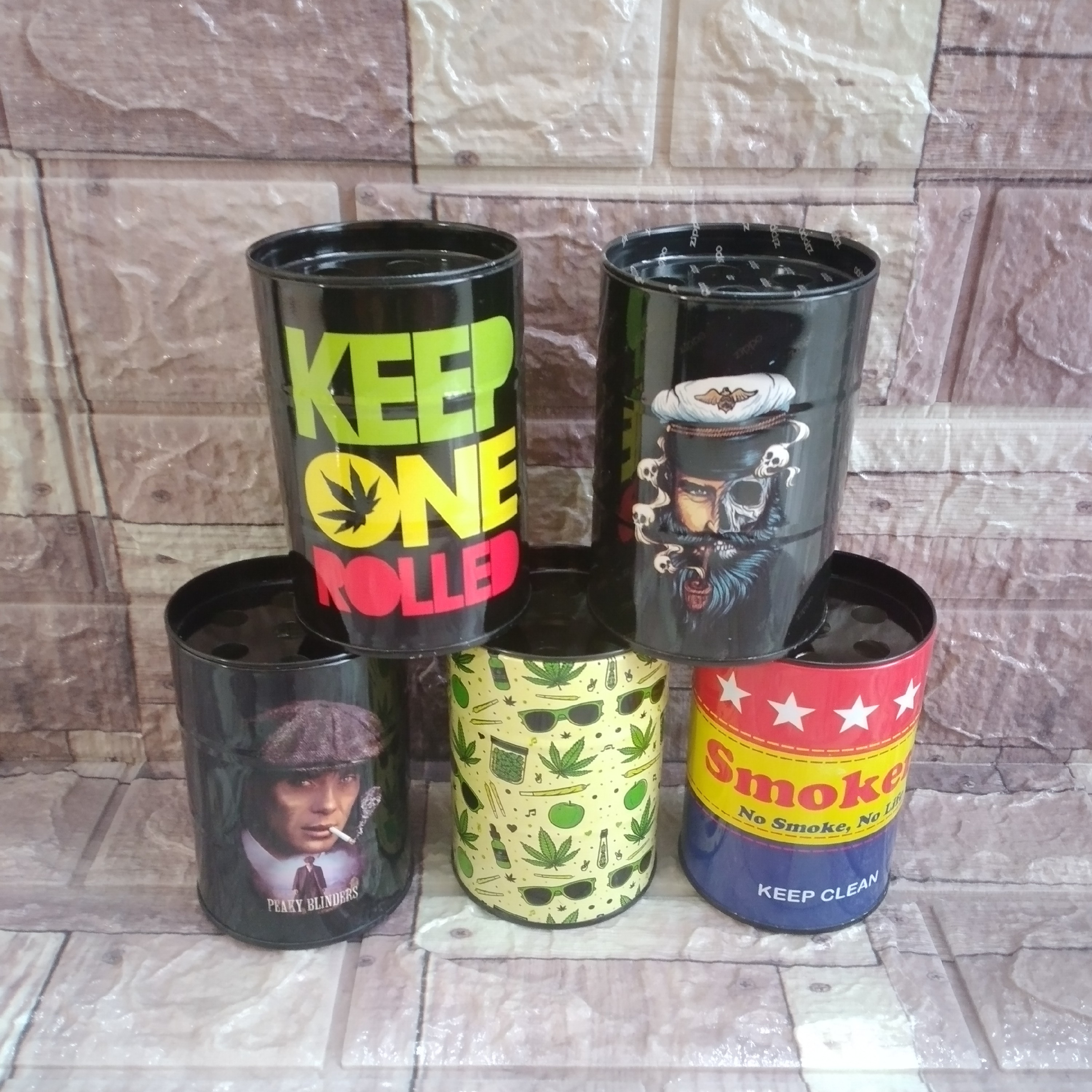 زیرسیگاری دربدار فلزی طرح بشکه در طرحهای زیبا و مختلف با چاپ عالی و رنگ نسوز ارتفاع ۱۰/۵ سانت و قطر ۷ سانت
