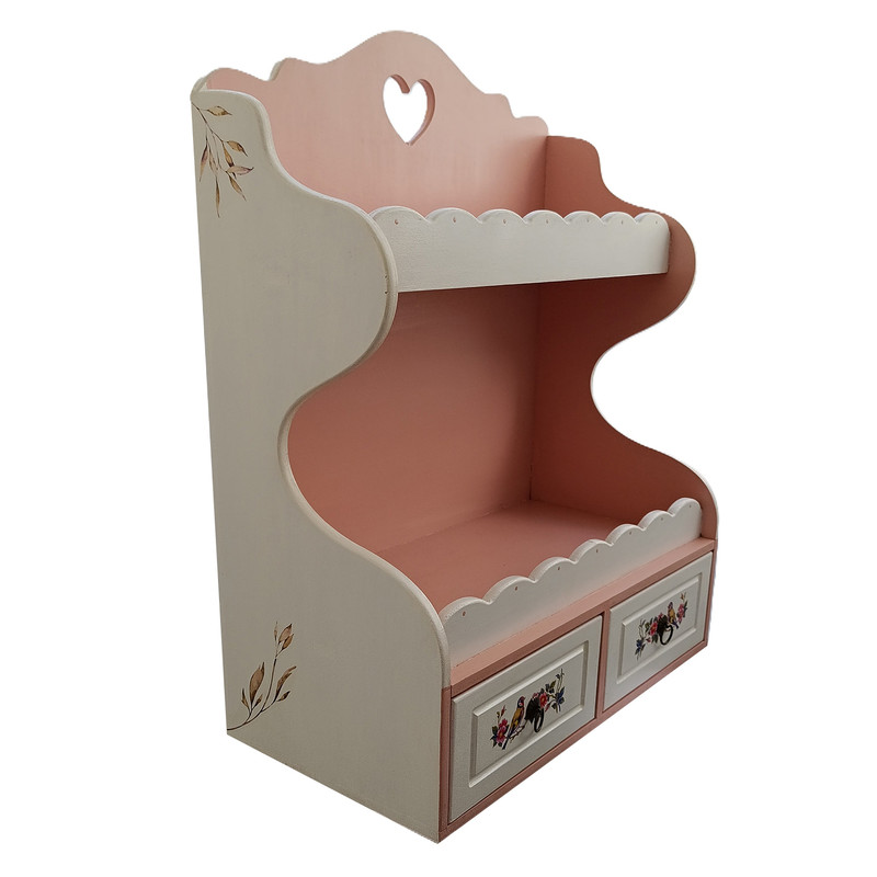 شلف رومیزی دارای دوطبقه با ابعاد طبقه بالا12*38 طبقه پایین 18*38و دو کشو با ابعاد 18*18است محصول ضد آب با باکیفیت ترین متریال خارجی به رنگ سفید صورتی ساخته شده است