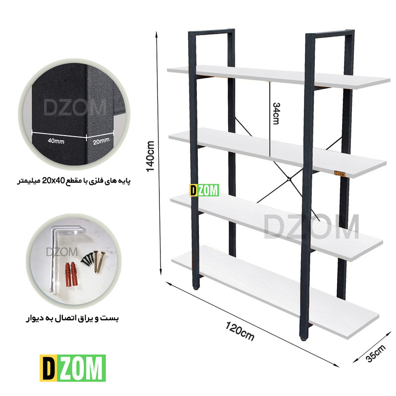 شلف دیزم DZom مدل SLF-43Z91-120W محصولی سبک، شیک و در عین حال جذاب و کارآمد از سری تولیدات دیزم میباشد. این محصول از پایه های فلزی با مقطع 20x40 میلیمتر و رنگ رویه الکترواستاتیک با ماندگاری و دوام بالا ساخته شده است. همچنین پایه های پیچی، قابلیت تنظیم نسبت به سطح زمین را دارد تا بهترین تراز جهت جلوگیری از تکان خوردن را ایجاد نماید. صفحه محصول از جنس MDF درجه یک برجسته طرح چوب به رنگ سفید می باشد. این محصول با طول 120cm، عرض 35cm و ارتفاع 140cmعرضه می شود. به این نکته توجه شود که تنوع رنگ انتخابی کالا تنها مربوط به رنگ پایه های فلزی میباشد و محصول به صورت کاملا مونتاژ شده و آماده استفاده برای مشتریان ال می گردد. توصیه میشود جهت حفظ ایمنی و ثبات بیشتر، محصول در یک یا دو نقطه به دیوار پیچ گردد.(یراق اتصال داخل بسته بندی موجود است).