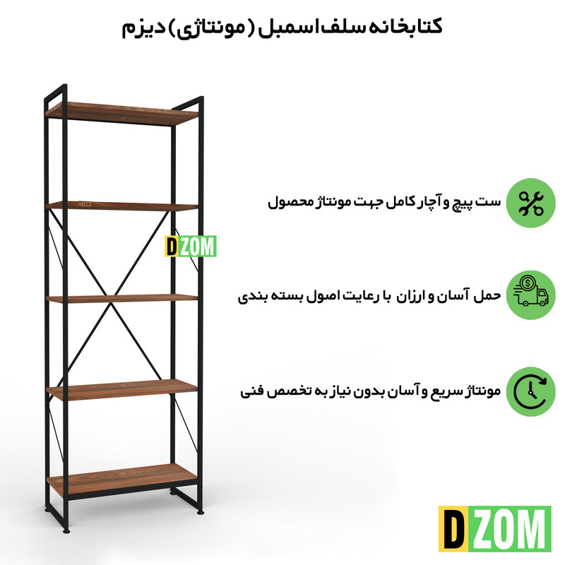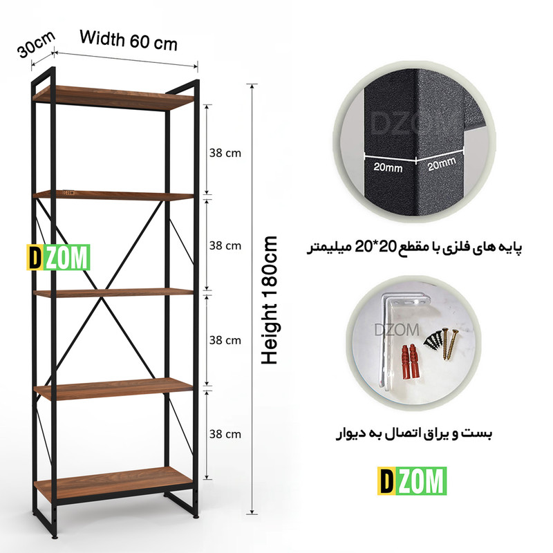 شلف ایستاده دیزم DZom مدل مونتاژی SLF_60×180_BRN محصولی مونتاژی، سبک، شیک و در عین حال جذاب و کارآمد از سری تولیدات دیزم میباشد. مشتری گرامی توجه نمایید محصولات برند دیزم (شماره ثبت 414013 اداره ثبت علائم تجاری) با کیفیت و بسته بندی اصلی تنها توسط فروشنده رسمی دیزم در دیجیکالا عرضه میشود، لطفاً از خرید کالای تقلبی از سایر فروشندگان خودداری فرمایید. این محصول بصورت سلف اسمبل (مونتاژی) تولید شده است. این شلف حمل و نقل ان و هزینه حمل مقرون به صرفه ای دارد. از پایه های فلزی با مقطع 20x20 میلیمتر و رنگ رویه الکترواستاتیک با ماندگاری و دوام بالا ساخته شده است. همچنین پایه های پیچی، قابلیت تنظیم نسبت به سطح زمین را دارد تا بهترین تراز جهت جلوگیری از تکان خوردن را ایجاد نماید. صفحات شلف از جنس MDF درجه یک برجسته طرح چوب به رنگ قهوه ای می باشد. این محصول با طول 60cm، عرض 30cm و ارتفاع 180cm عرضه می شود. به این نکته توجه شود که تنوع رنگ انتخابی کالا تنها مربوط به رنگ پایه های فلزی میباشد. توصیه میشود جهت حفظ ایمنی و ثبات بیشتر، محصول در یک یا دو نقطه به دیوار پیچ گردد.(یراق اتصال داخل بسته بندی موجود است).