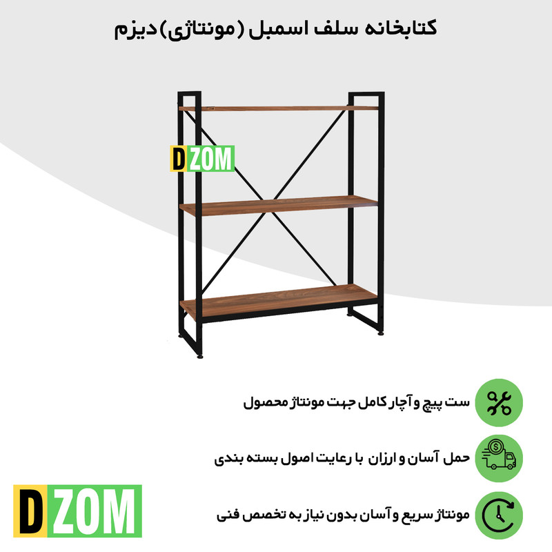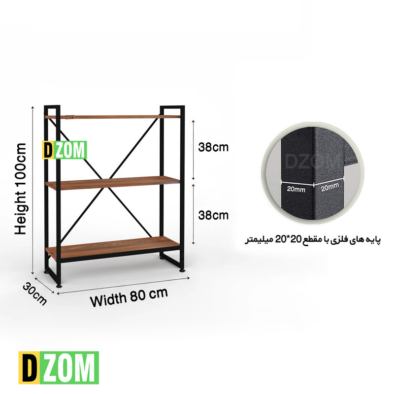 شلف ایستاده دیزم DZom مدل مونتاژی SLF_80×100_BRN محصولی مونتاژی، سبک، شیک و در عین حال جذاب و کارآمد از سری تولیدات دیزم میباشد. مشتری گرامی توجه نمایید محصولات برند دیزم (شماره ثبت 414013 اداره ثبت علائم تجاری) با کیفیت و بسته بندی اصلی تنها توسط فروشنده رسمی دیزم در دیجیکالا عرضه میشود، لطفاً از خرید کالای تقلبی از سایر فروشندگان خودداری فرمایید. این محصول بصورت سلف اسمبل (مونتاژی) تولید شده است. این شلف حمل و نقل ان و هزینه حمل مقرون به صرفه ای دارد. از پایه های فلزی با مقطع 20x20 میلیمتر و رنگ رویه الکترواستاتیک با ماندگاری و دوام بالا ساخته شده است. همچنین پایه های پیچی، قابلیت تنظیم نسبت به سطح زمین را دارد تا بهترین تراز جهت جلوگیری از تکان خوردن را ایجاد نماید. صفحات شلف از جنس MDF درجه یک برجسته طرح چوب به رنگ قهوه ای می باشد. این محصول با طول 80cm، عرض 30cm و ارتفاع 100cm عرضه می شود. به این نکته توجه شود که تنوع رنگ انتخابی کالا تنها مربوط به رنگ پایه های فلزی میباشد.