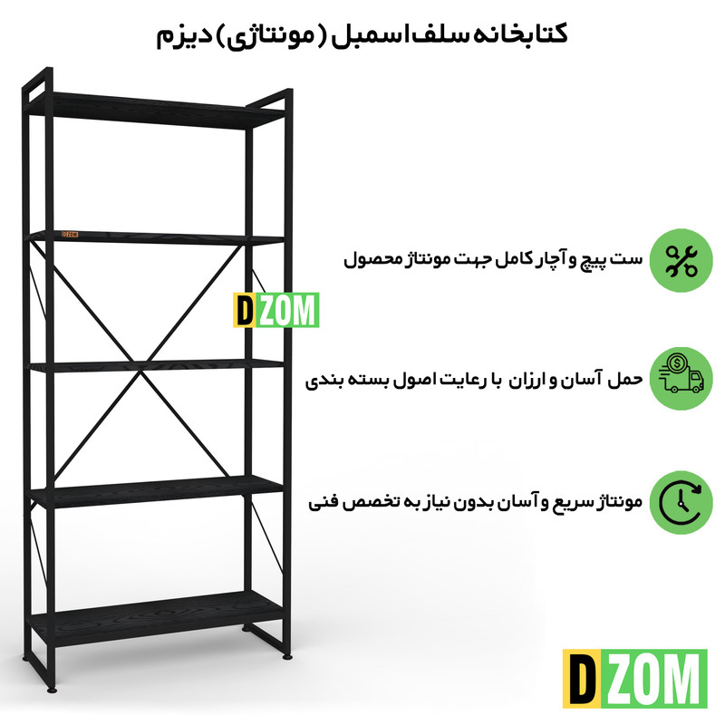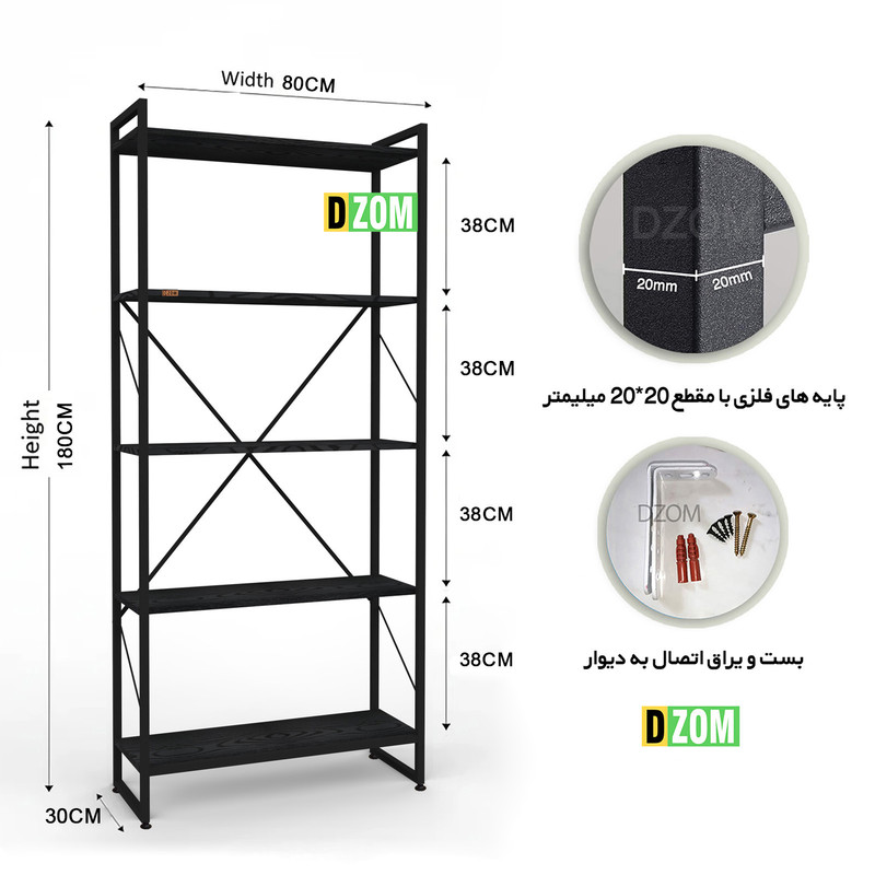 شلف ایستاده دیزم DZom مدل مونتاژی SLF_80×180_B محصولی مونتاژی، سبک، شیک و در عین حال جذاب و کارآمد از سری تولیدات دیزم میباشد. مشتری گرامی توجه نمایید محصولات برند دیزم (شماره ثبت 414013 اداره ثبت علائم تجاری) با کیفیت و بسته بندی اصلی تنها توسط فروشنده رسمی دیزم در دیجیکالا عرضه میشود، لطفاً از خرید کالای تقلبی از سایر فروشندگان خودداری فرمایید. این محصول بصورت سلف اسمبل (مونتاژی) تولید شده است. این شلف حمل و نقل ان و هزینه حمل مقرون به صرفه ای دارد. از پایه های فلزی با مقطع 20x20 میلیمتر و رنگ رویه الکترواستاتیک با ماندگاری و دوام بالا ساخته شده است. همچنین پایه های پیچی، قابلیت تنظیم نسبت به سطح زمین را دارد تا بهترین تراز جهت جلوگیری از تکان خوردن را ایجاد نماید. صفحات شلف از جنس MDF درجه یک برجسته طرح چوب به رنگ مشکی می باشد. این محصول با طول 80cm، عرض 30cm و ارتفاع 180cm عرضه می شود. به این نکته توجه شود که تنوع رنگ انتخابی کالا تنها مربوط به رنگ پایه های فلزی میباشد. توصیه میشود جهت حفظ ایمنی و ثبات بیشتر، محصول در یک یا دو نقطه به دیوار پیچ گردد.(یراق اتصال داخل بسته بندی موجود است).