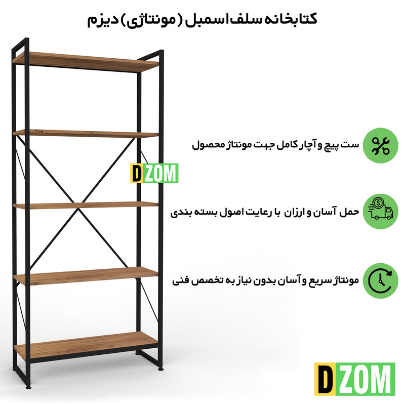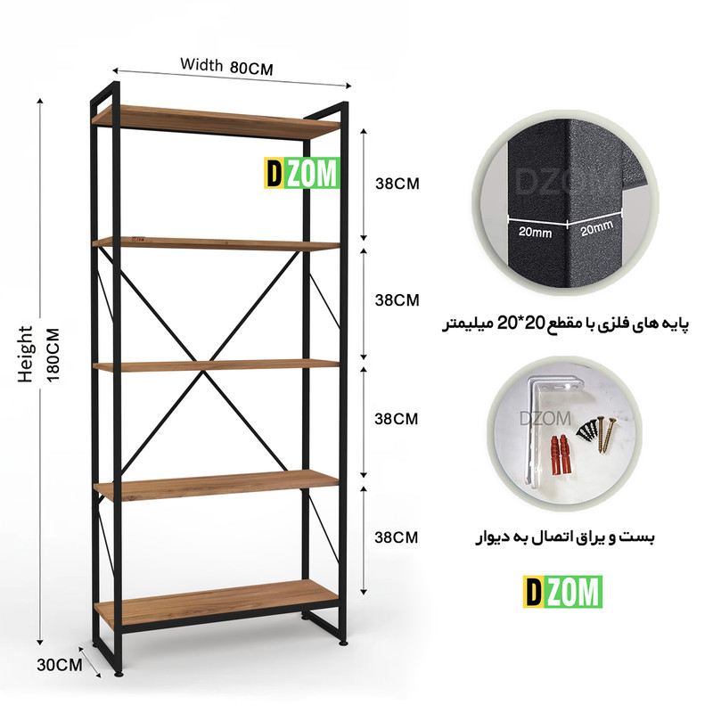 شلف ایستاده دیزم DZom مدل مونتاژی SLF_80×180_LIGHT محصولی مونتاژی، سبک، شیک و در عین حال جذاب و کارآمد از سری تولیدات دیزم میباشد. مشتری گرامی توجه نمایید محصولات برند دیزم (شماره ثبت 414013 اداره ثبت علائم تجاری) با کیفیت و بسته بندی اصلی تنها توسط فروشنده رسمی دیزم در دیجیکالا عرضه میشود، لطفاً از خرید کالای تقلبی از سایر فروشندگان خودداری فرمایید. این محصول بصورت سلف اسمبل (مونتاژی) تولید شده است. این شلف حمل و نقل ان و هزینه حمل مقرون به صرفه ای دارد. از پایه های فلزی با مقطع 20x20 میلیمتر و رنگ رویه الکترواستاتیک با ماندگاری و دوام بالا ساخته شده است. همچنین پایه های پیچی، قابلیت تنظیم نسبت به سطح زمین را دارد تا بهترین تراز جهت جلوگیری از تکان خوردن را ایجاد نماید. صفحات شلف از جنس MDF درجه یک برجسته طرح چوب به رنگ قهوه ای روشن می باشد. این محصول با طول 80cm، عرض 30cm و ارتفاع 180cm عرضه می شود. به این نکته توجه شود که تنوع رنگ انتخابی کالا تنها مربوط به رنگ پایه های فلزی میباشد. توصیه میشود جهت حفظ ایمنی و ثبات بیشتر، محصول در یک یا دو نقطه به دیوار پیچ گردد.(یراق اتصال داخل بسته بندی موجود است).