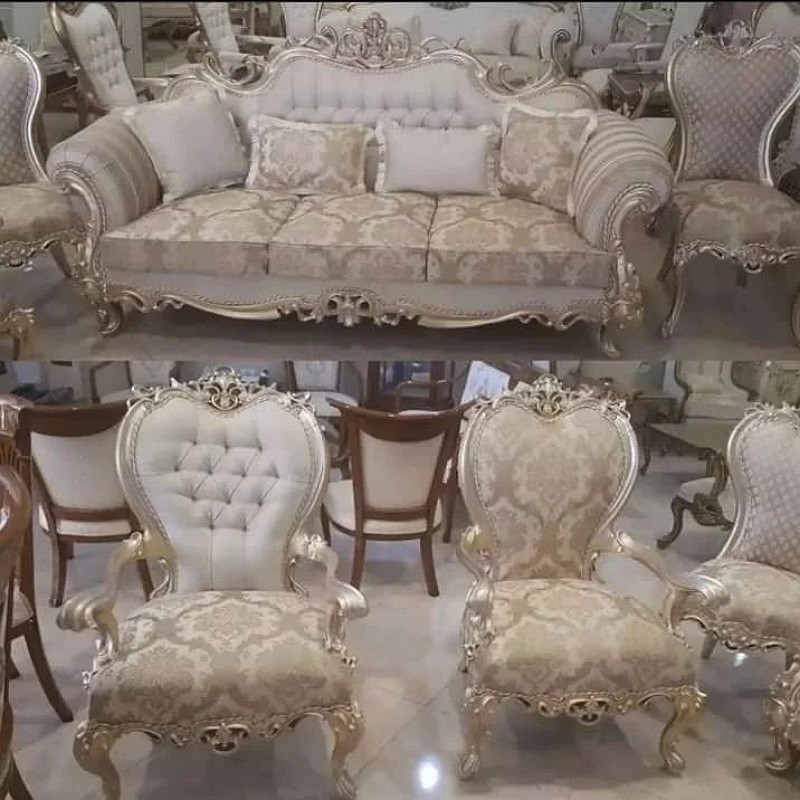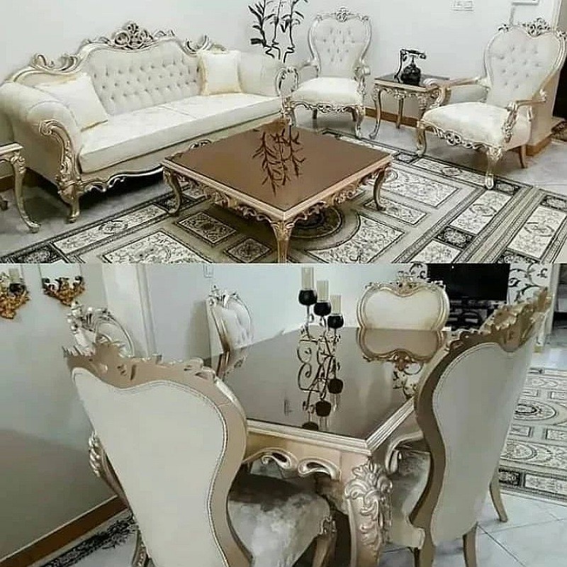 ارسال با باربری مبل سلطنتی مدل افسون بسیارشکیل وزیبا نشیمن نه نفره باترکیب جلومبلی وعسلی چوب راش گرجستان جنس پارچه بدنه دیاموند پارچه طرح دار شانل تراکم فوم سرد13سانت شرکتی اسفنج30کیلو ویژه