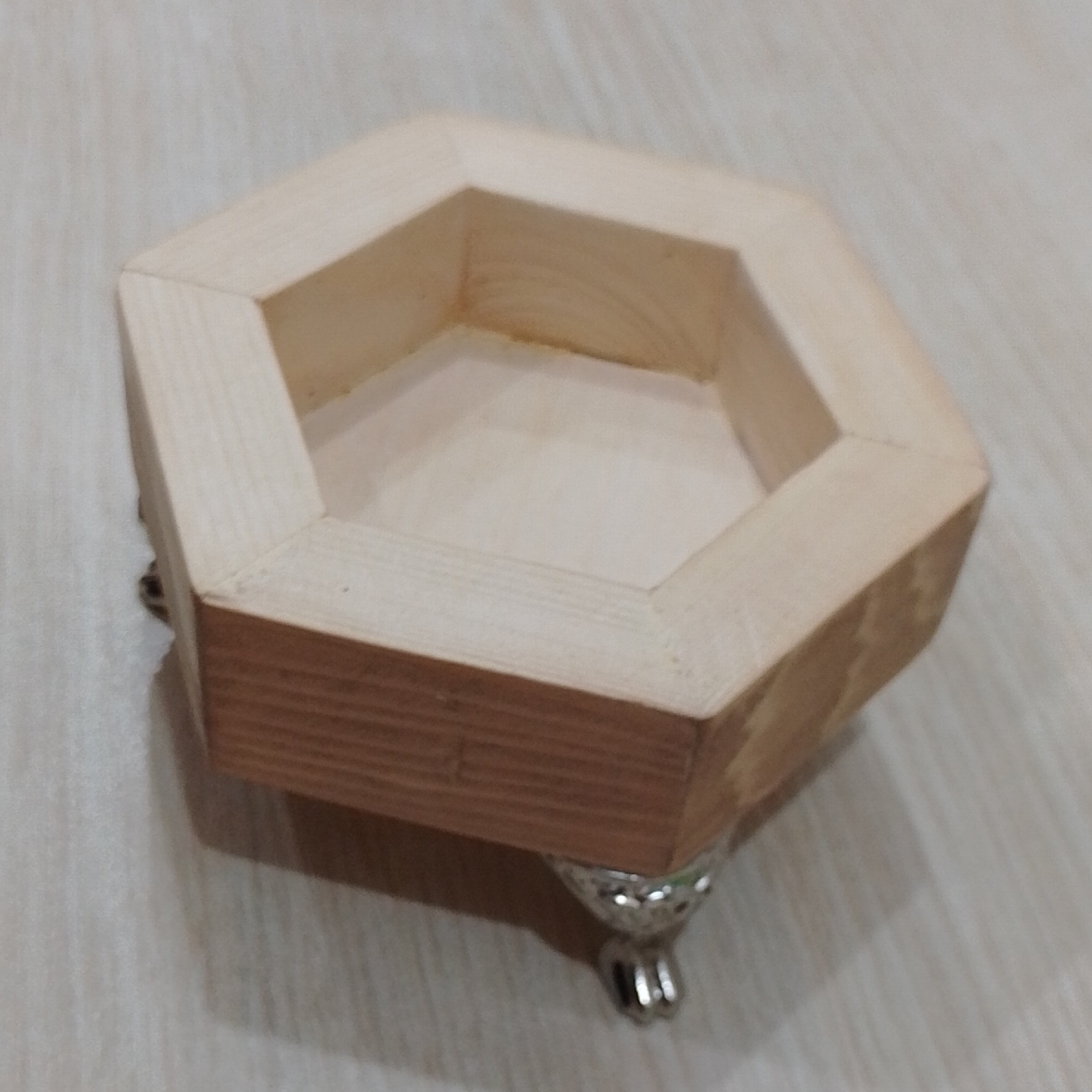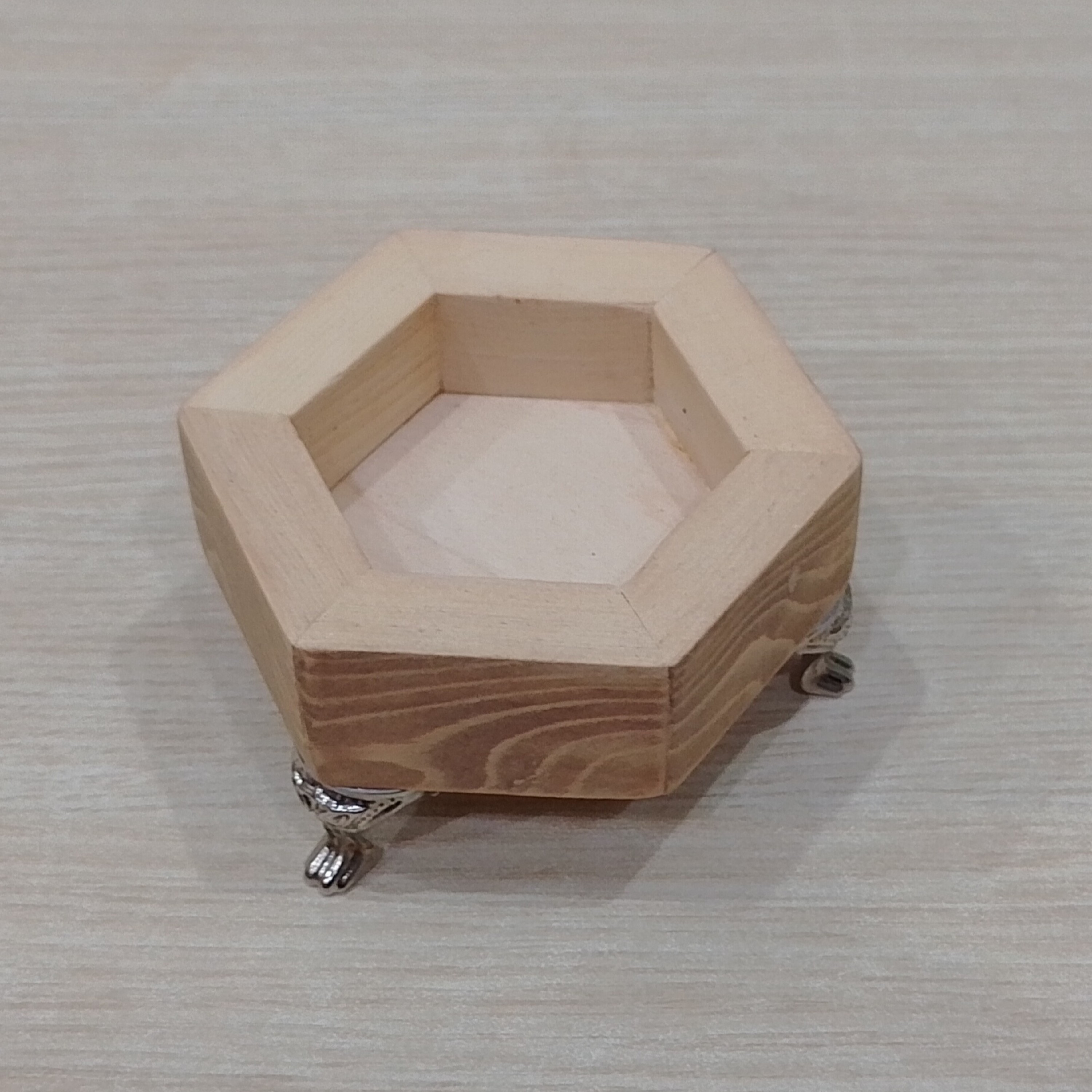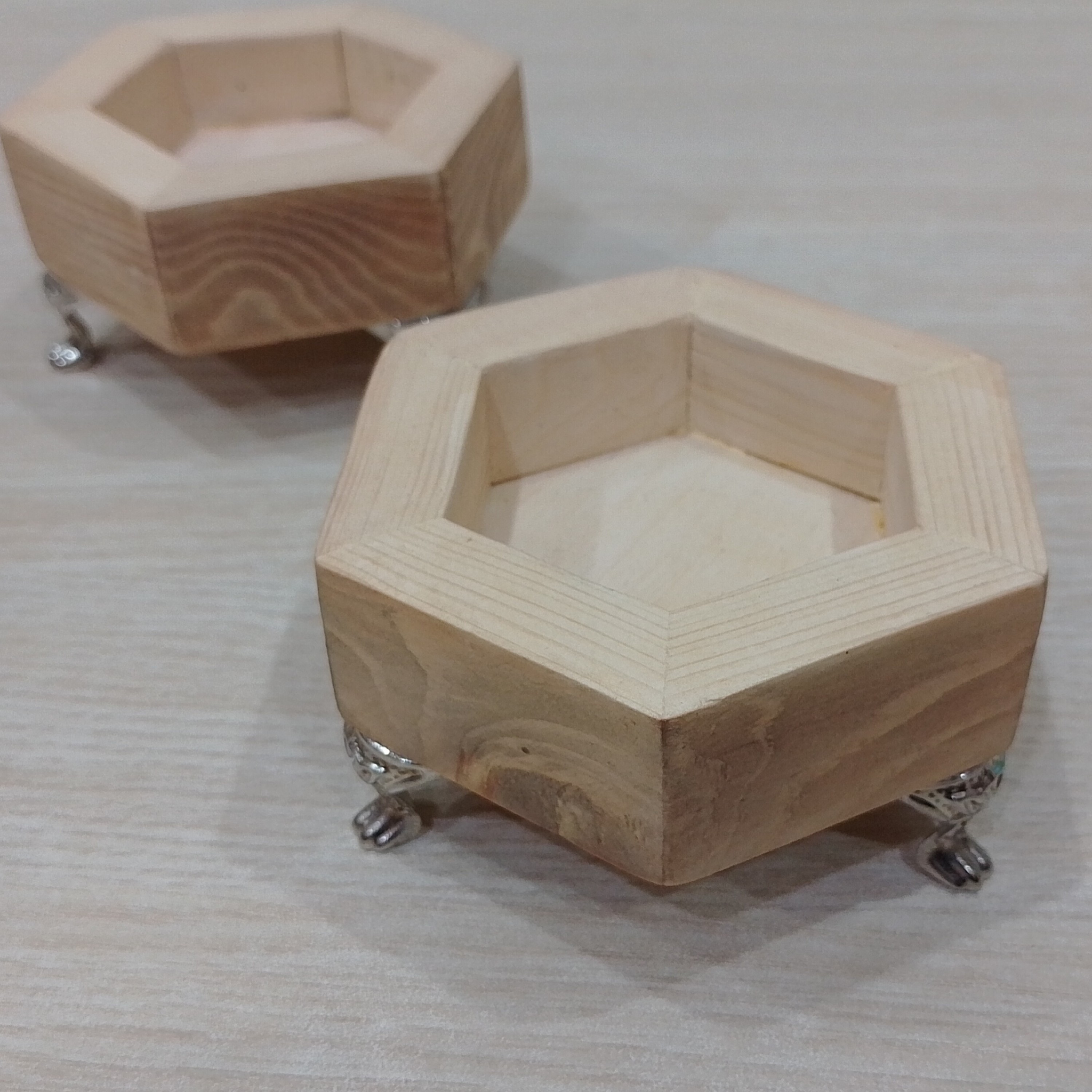 کاسه چوبی شش ضلعی پایه دار دستساز و از چوب درجه یک روس ساخته شده است. آبگریز بوده پس می توان شستوشو داد سپس بوسیله پارچه ای خشکنمود.از این محصول می توان در تزیین سفره هفت سین استفاده نمود. همچنین در پذیرایی بعنوان قندان و آجیل خوری قابل استفاده است. ضمن اینکه محصول در اندازه مناسب و قطر دهانه 12 سانتیمتر می باشدکه در دید مخاطب ظرفیت بالایی را نمایان می دارد به گونه ای طراحی شده که ظرفیت واقعی آن کمتر از تصور وحدود ۵۰ گرم آجیل را در خود جای می دهد و مناسب پذیرایی یک نفره است. کاسه دارای سه پایه با لعاب استیل طرح سنتی بوده که در سطوح ناهموار نیز کاملا متعادل قرار می گیرد.