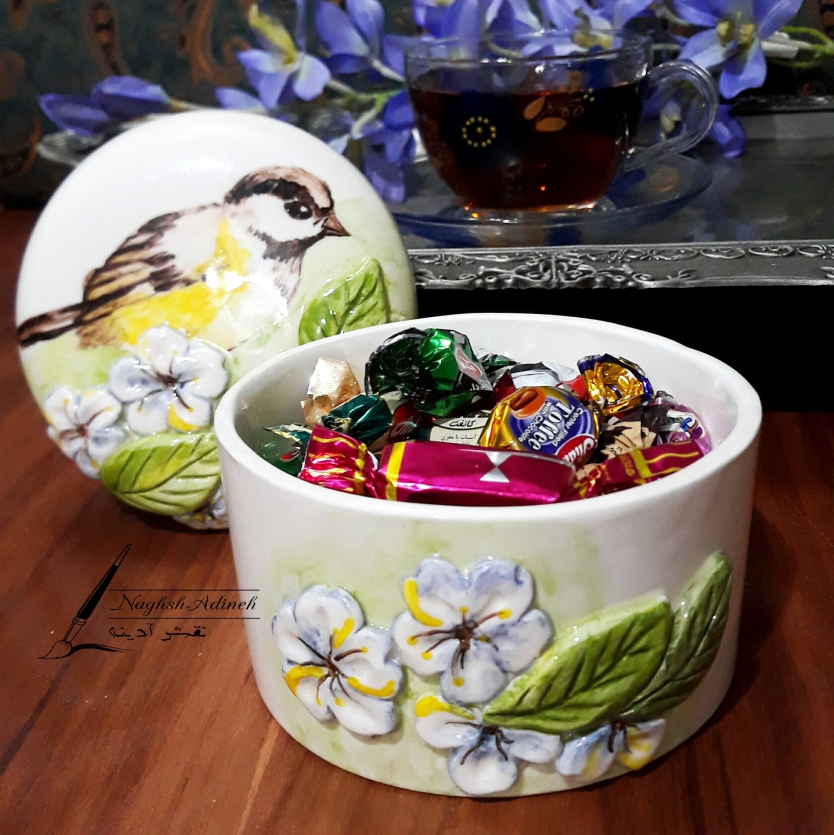 شکلاتخوری ،یا ظرف آجیل و قندان صفر تا صد کار دست سرامیکی مناسب جهت پذیرایی، کادو و جهیزیه عروس قابل ست کردن و سفارش با سایر ظروف پذیرایی و فنجان