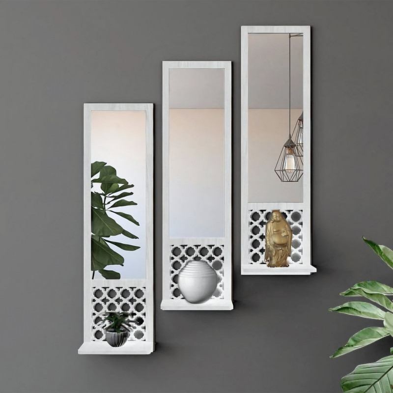 شلف دیواری زیبا و کارآمد با طراحی بی نظیر! در طراحی این شلف دیواری ام دی اف از آینه شیشه ای با لبه های ابزار شده مستطیل در قسمت بالا استفاده شده و طبقه دکوری زیرین، به شما امکان می دهد تا اشیای دلخواهتان را با سبکی منحصر به فرد نگهداری کنید. همچنین با وجود قلاب آویز پشت شلف، می توانید براحتی روی دیوار نصب کنید . با استفاده از این شلف دیواری، محیط خانه خود را به یک فضای شیک و خوش آمدگویی تبدیل کنید. شلف مدل H40 یکی از محصولات برند الیکسار در بسته بندی 3 عددی تولید میگردد.