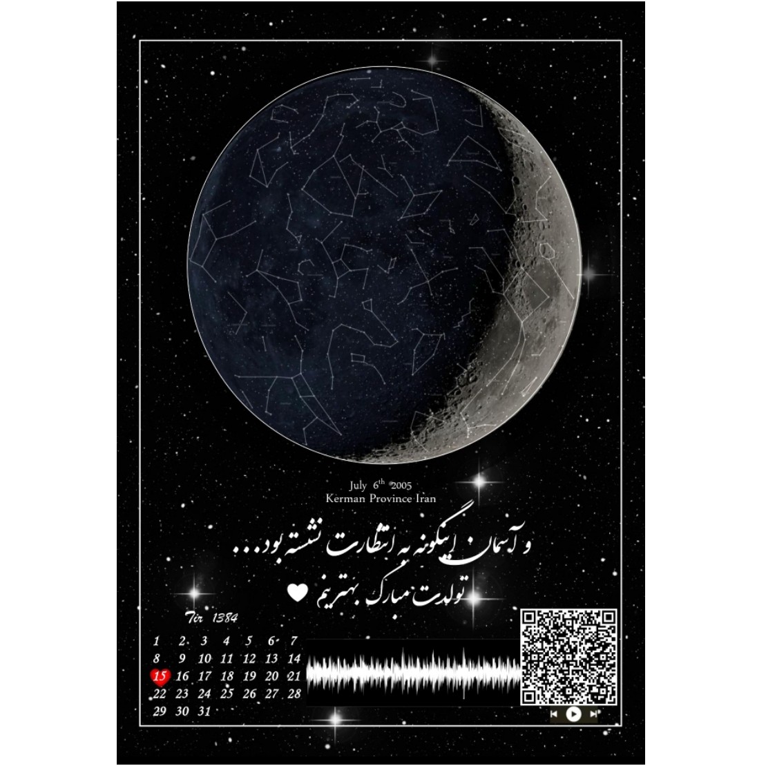 این تابلو، موقعیت ستارگان آسمان و حالت ماه را بر اساس زمان و مکان خاص انتخابی شما به تصویر میکشد. هدیهای مناسب برای ثبت لحظات مهم، مانند تولد، سالگرد دوستی و ازدواج و … می باشد. تابلو آسمان شب ، هدیهای متفاوت و جدید است که داستانی از ستارههای شب شما را بازگو میکند و یادگاری از روزهای خوش زندگی است. تمدنهای کهن اعتقاد داشتند که ستارگان و اجرام آسمانی بر زندگی و سرنوشت انسان تأثیرگذارند. که این باورها تا به امروز در قالب طالع بینی همراه ما بوده است. این تابلو جذاب نشان میدهد در شب تولدتان یا سالگرد ازدواج، ستارگان آسمان و صورتهای فلکی و یا ماه در چه وضعیتی قرار داشتند. به دلیل چرخش زمین، هرلحظه موقعیت ستارگان در حال تغییر است و به همین دلیل محل قرارگیری ستارگان در شب تولد هر فردی، خاص او و متفاوت از دیگران میباشد. تابلوی آسمان قابلیتهای سفارشیسازی متعددی دارد، که میتوانید مطابق سلیقهتان آنها را تغییر دهید.