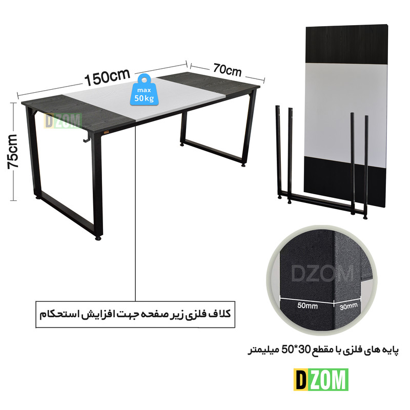 میز مدیریت DZom مدل مونتاژی TLD_asm_150×70_Tri_BAW محصولی مونتاژی، سبک، شیک و در عین حال جذاب و کارآمد از سری تولیدات میباشد. این محصول بصورت سلف اسمبل (مونتاژی) تولید شده است. این میز حمل و نقل آسان و هزینه حمل مقرون به صرفه ای دارد. این میز از پایه های فلزی با مقطع 50x30 میلیمتر و رنگ رویه الکترو با ی و دوام بالا ساخته شده است. همچنین پایه های پیچی، قابلیت تنظیم نسبت به سطح زمین را دارد تا بهترین تراز جهت جلوگیری از تکان خوردن را ایجاد نماید. صفحه میز از جنس MDF درجه یک برجسته طرح چوب با ترکیبی از دو رنگ مشکی و سفید می باشد. این محصول با طول 150cm، عرض 70cm و ارتفاع 75cm عرضه می شود. به این نکته توجه شود که تنوع رنگ انتخابی کالا تنها مربوط به رنگ پایه های فلزی میباشد.